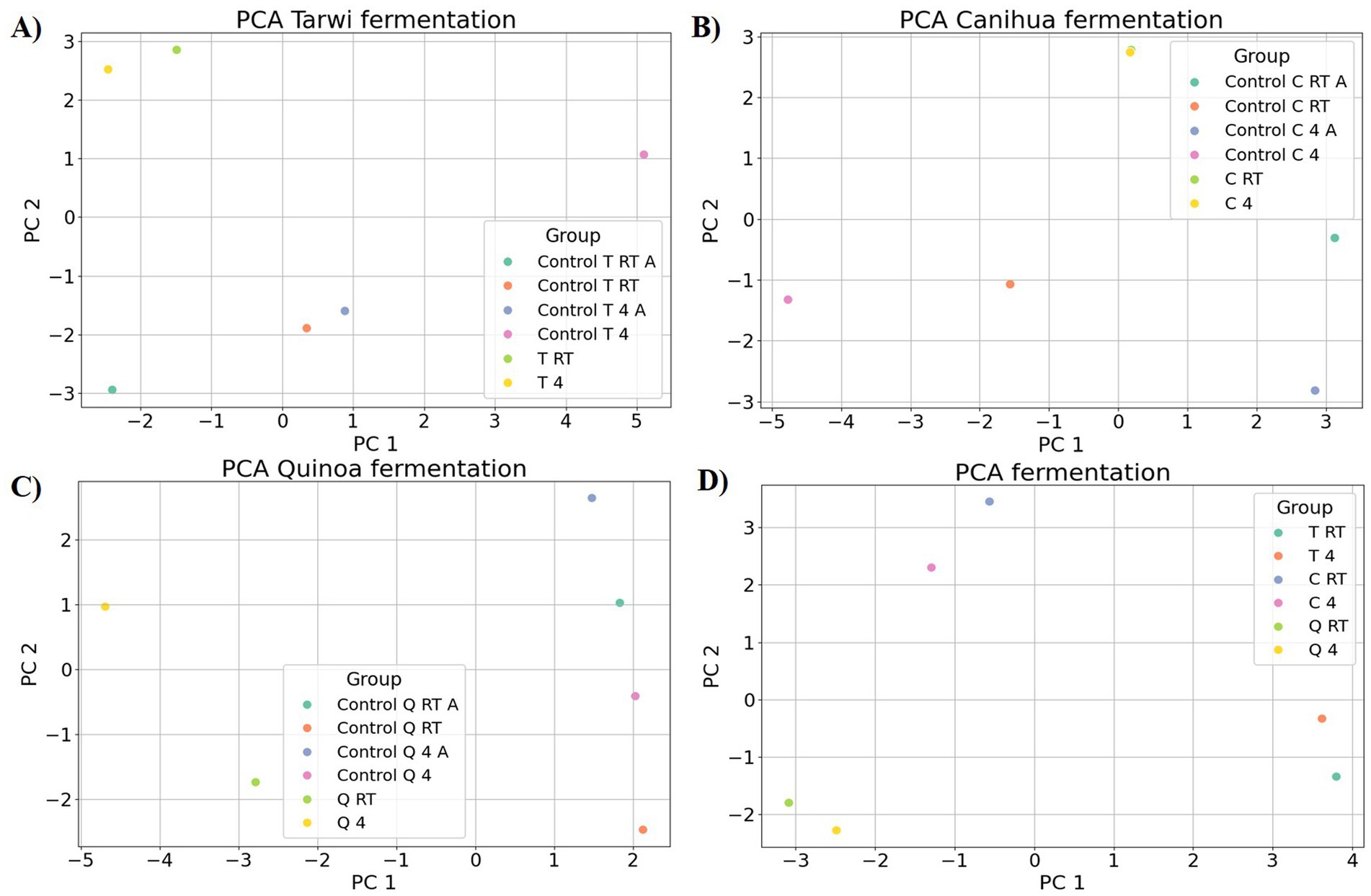 Figure 6. Principal component analysis (PCA) of amino acid profiles across fermentation treatments. (A) tarwi, (B) cañihua, (C) quinoa, and (D) all fermented samples. All plots were made in Python (v3.11) using matplotlib (v3.8.0) and seaborn (v0.13.0).