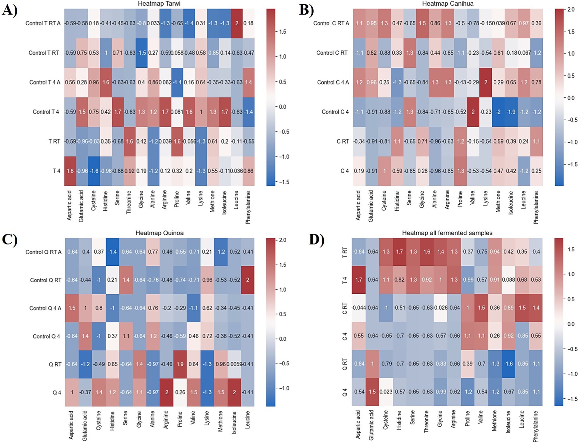 Figure 7. Heat maps of controls. RT, room temperature prior treatment; 4, 4 °C; A, autoclaved control; (A) Tarwi, (B) Cañihua, (C) quinoa, and (D) all fermented samples. All plots were made in Python (v3.11) using matplotlib (v3.8.0) and seaborn (v0.13.0).