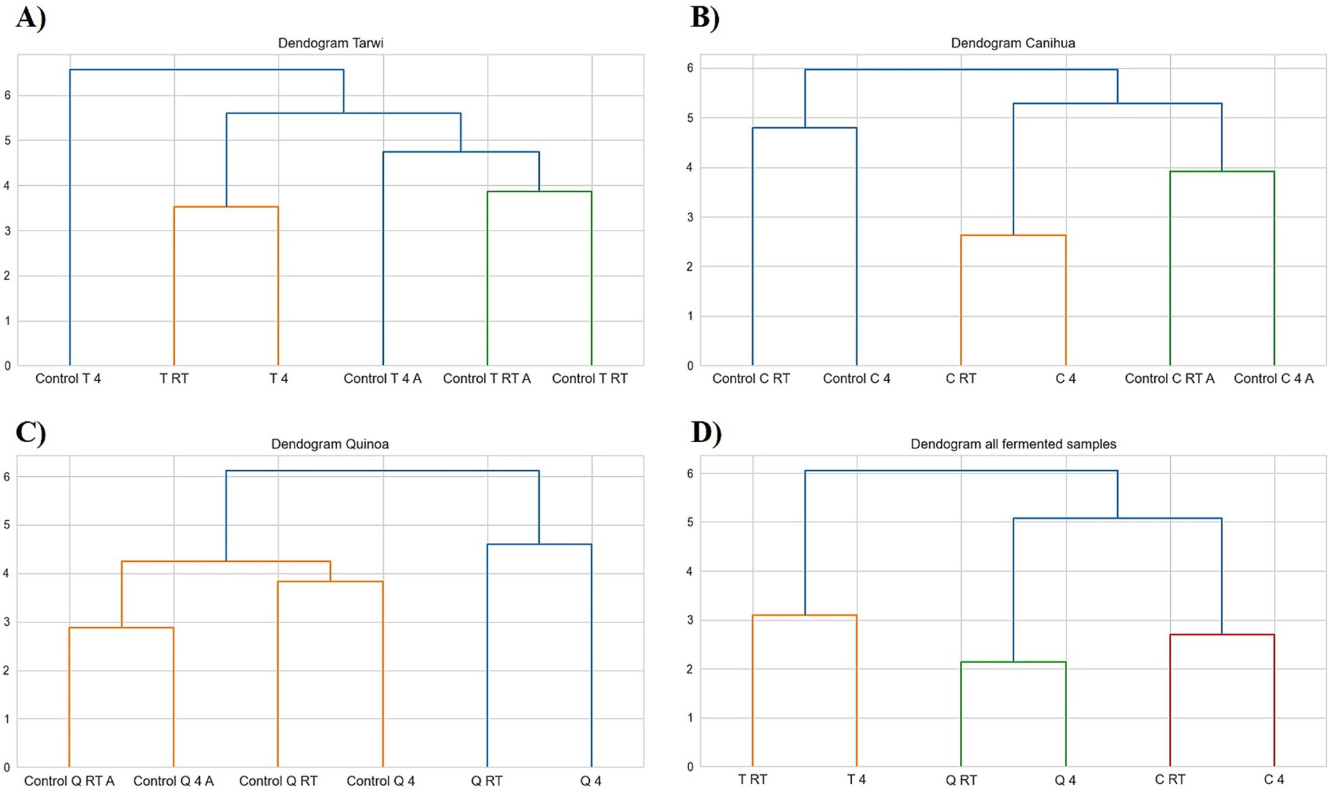 Figure 8. Dendrograms of controls; RT, room temperature prior treatment; 4, 4 °C; A, autoclaved control; (A) Tarwi, (B) Cañihua, (C) Quinoa, and (D) all fermented samples. All plots were made in Python (v3.11) using matplotlib (v3.8.0) and seaborn (v0.13.0).