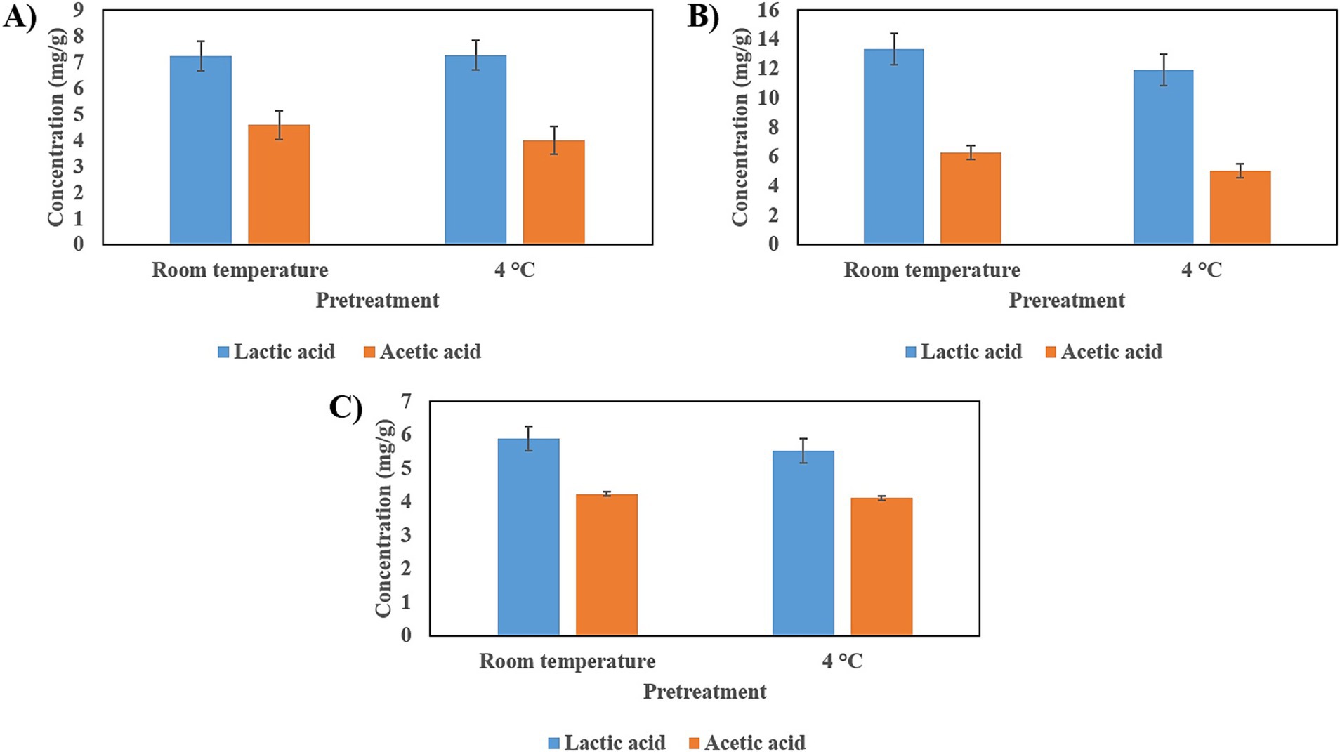 In all three seeds, lactic acid and acetic acid were produced. The product of fermentation from cañihua seeds shows the highest levels of those acids (Figure 9).
