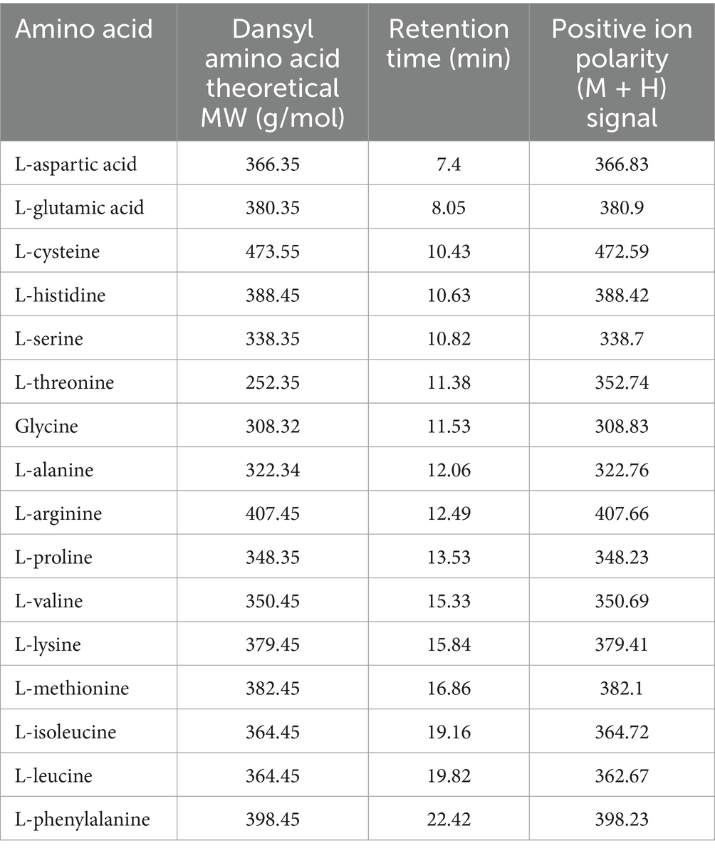 The identification of amino acids and GABA was based on their derivatization with dansyl chloride, and the molecular weight of the derivatised amino acids was determined using LC–MS. Table 1 shows the molecular weights identified.