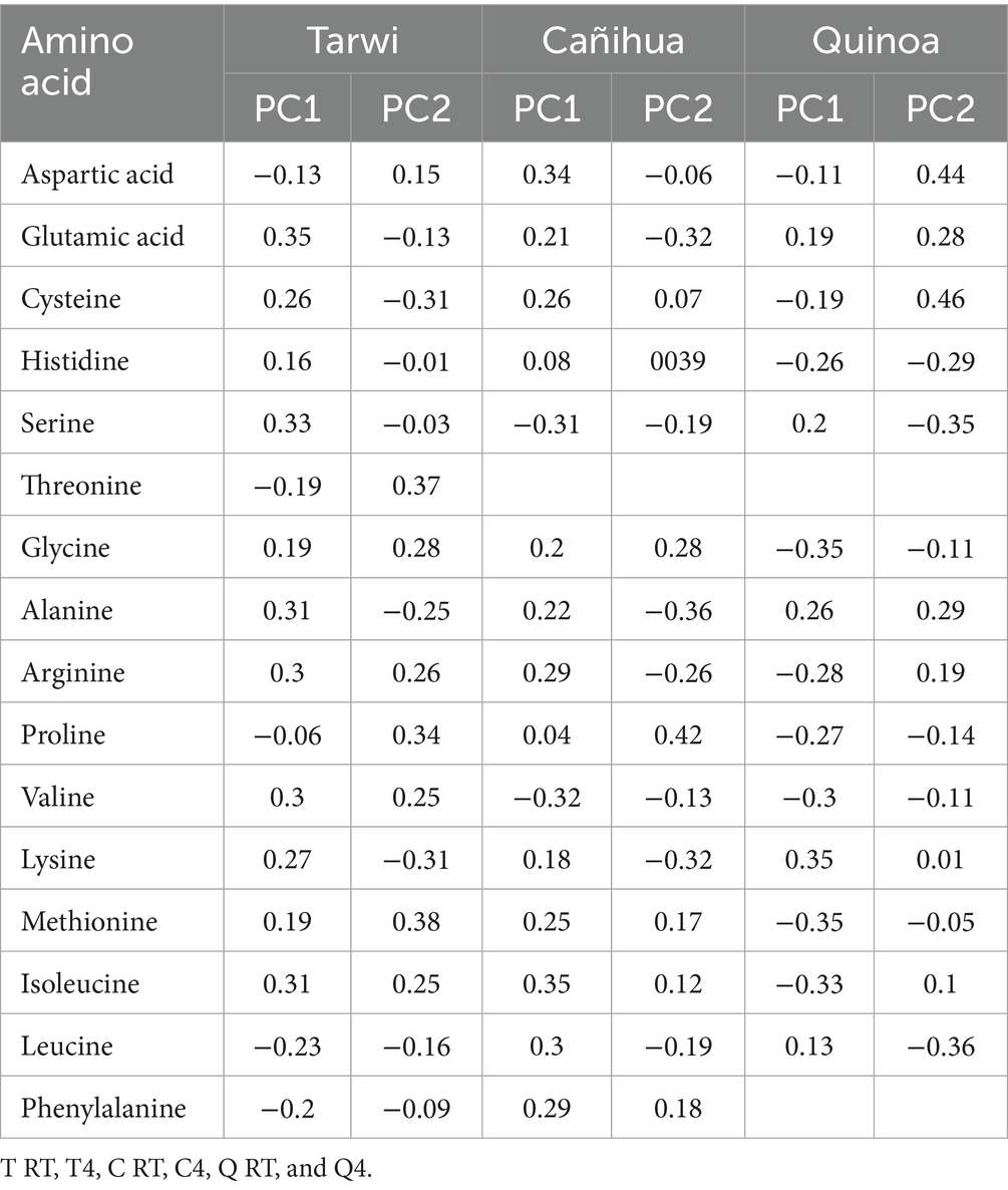 Another interesting result is the influence of autoclaving on the amino acid composition of the seeds. In tarwi seeds, autoclaving resulted in a decrease in the concentration of most amino acids. In cañihua seeds, the opposite effect was observed; most of the amino acids increased in concentration after autoclaving. Finally, in quinoa seeds, there was no clear tendency, unlike in the other seeds; almost half of the amino acids decreased in concentration, while the other half increased in concentration.