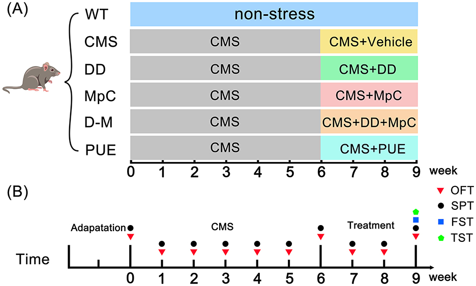 Mice were randomly assigned to six groups: Wild-type (WT, n = 6), CMS (n = 6), DD (n = 6), MpC (n = 6), daidzein + methyl p-coumarate (D+M, n = 6), and PUE (n = 6). As described previously (21), mice were acclimatized to the environment for 2 weeks, followed by 6 weeks of exposure to various mild stressors. Stressors included restraint (2 h), wet bedding (24 h), no bedding (24 h), loud noise (12 h), tilted cage (45°, 24 h), strobe lighting (12 h), reversed light/dark cycle (24 h), food restriction (12 h), and tail suspension (2 h). During the final 3 weeks, mice were treated with different drugs (20 mg/kg, qd) while being exposed to CMS, as illustrated in Figure 1A.