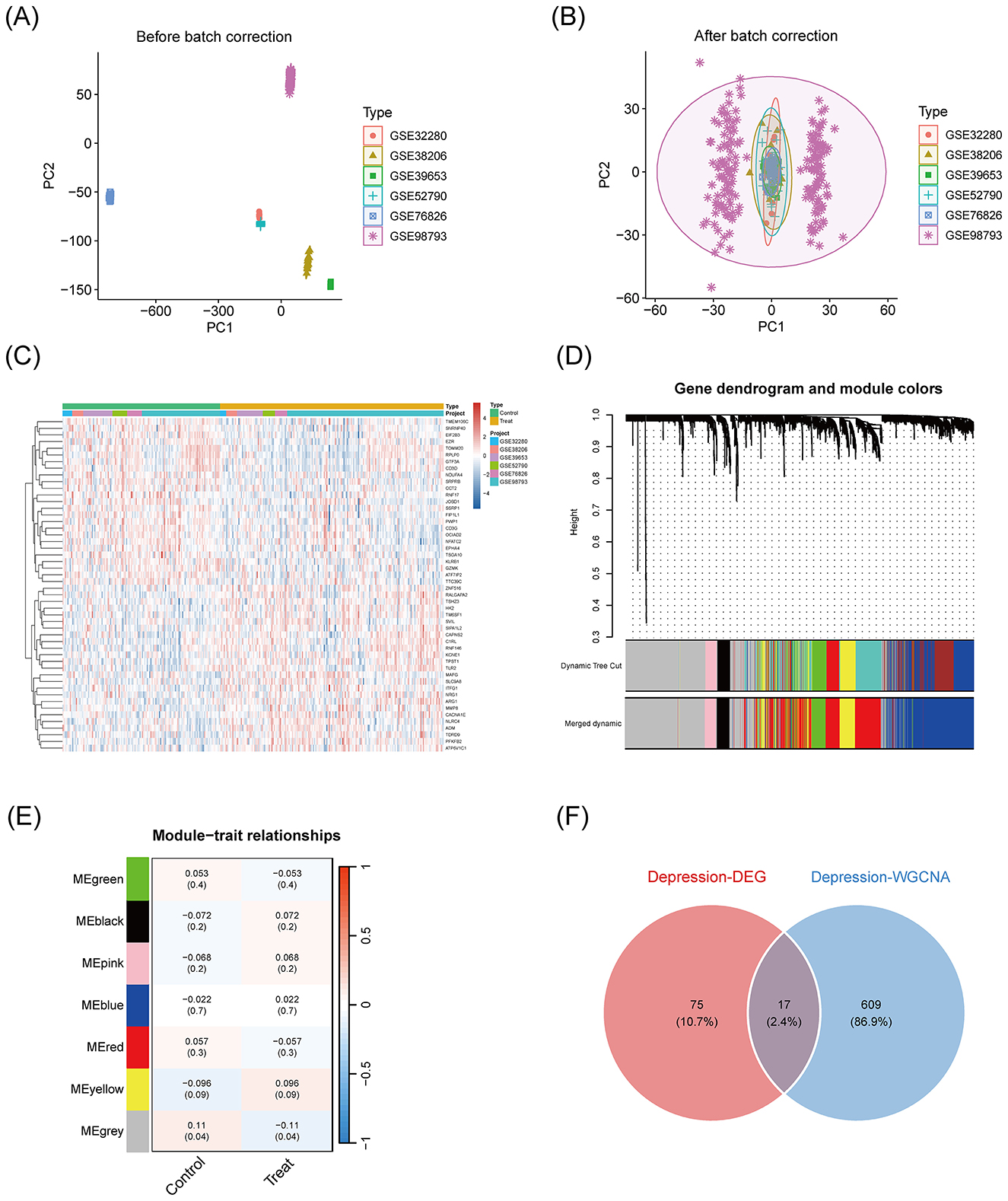 Figure 2. Dietary intervention target screening for depression based on transcriptome integration analysis. (A) Pre-batch-corrected PCA plots: dispersion distributions of the six GEO datasets (GSE32280, GSE38206, GSE39653, GSE52790, GSE76826, GSE98793) on the PC1 (−600 to 200) and PC2 (−150 to 100) axes reflecting the impact of batch effects. (B) Batch-corrected PCA plot: data points are clustered on the PC1 (−60 to 60) and PC2 (−40 to 40) axes, confirming the elimination of the batch effect. (C) Clustering heatmap of differentially expressed genes: the top 25 DEGs (ordered by p-value) screened based on |logFC|>0.1 and adj.p.Val < 0.05, demonstrating the differences in expression patterns between the disease and control groups. (D) WGCNA Dynamic Tree Cutting Module: gene dendrogram (height 0–1.0) with color blocks identifying co-expression modules. (E) Module-trait correlation analysis: only the MEGrey module was significantly and positively correlated with depression (r = 0.11, p = 0.04), the rest of the modules were not statistically significant (p > 0.09). (F) Wayne diagram of potential targets: integration of differential genes and WGCNA module genes with three components, include 75 differential genes (DEGs, 10.7%), 609 WGCNA module genes (86.9%), and 17 intersecting genes (2.4%).