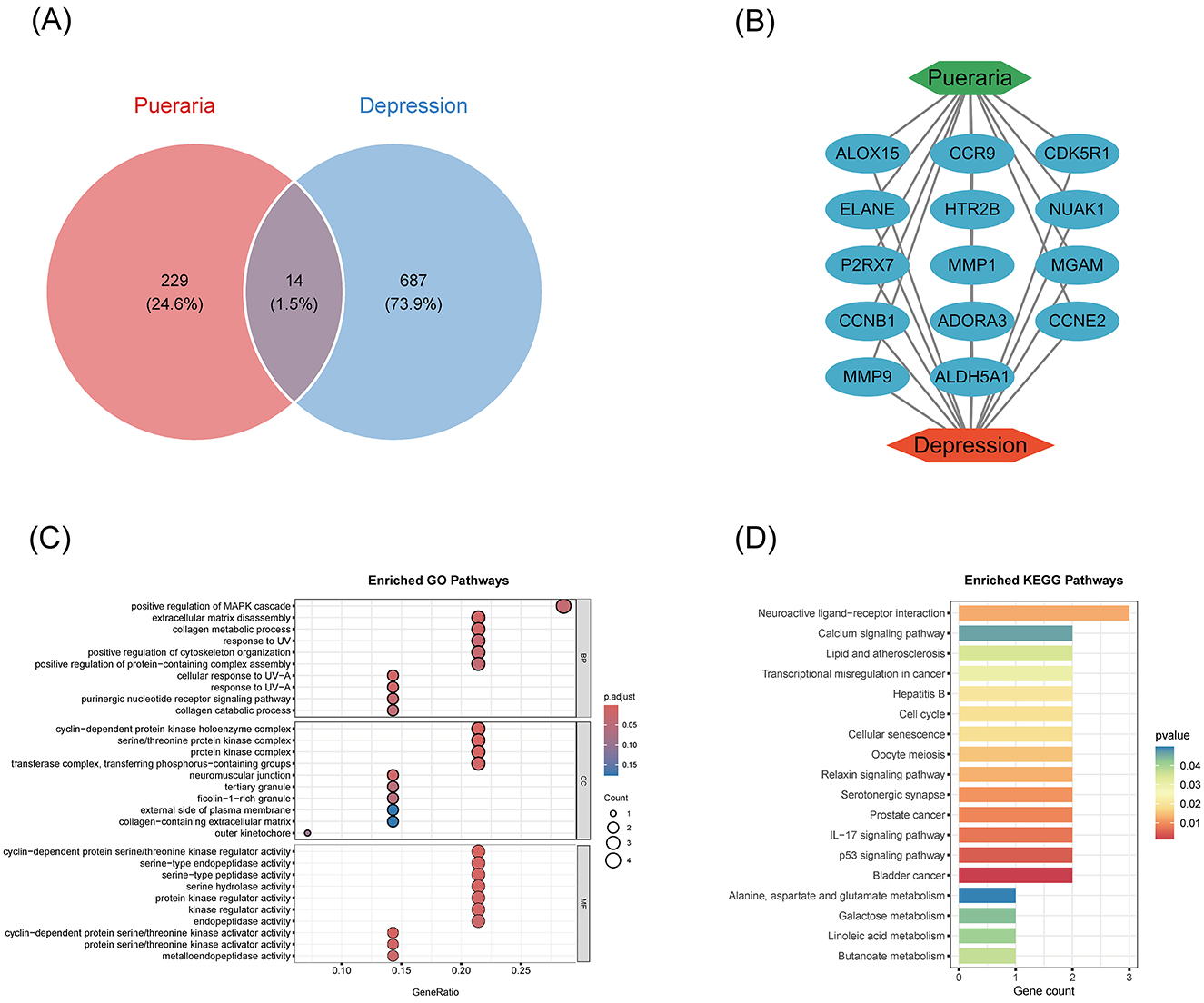 Figure 3. Functional enrichment analysis of Pueraria active constituents with intersecting targets for depression. (A) Wayne's diagram: showing the targets of Pueraria action (229, 24.6%), the targets of depressive disorders (687, 73.9%), and their intersecting genes (14, 1.5%), reflecting the overlap of the two targets. (B) Intersecting gene relationship network: presenting the functional interactions of 14 intersecting genes (e.g. ALDH5A1, MMP9, ADORA3, etc.). (C) GO enrichment analysis: dot plots demonstrating the enrichment of intersecting genes in biological processes, molecular functions, and cellular components, with GeneRatio (enriched gene ratio) on the horizontal axis and GO entries on the vertical axis, with the dot size indicating the number of enriched genes and the color depth indicating the adjusted p-value. (D) KEGG enrichment analysis: dot plot demonstrating the enrichment of intersecting genes in the signaling pathway, with Gene count (number of enriched genes) on the horizontal axis, KEGG pathway on the vertical axis, and p-value indicated by color.