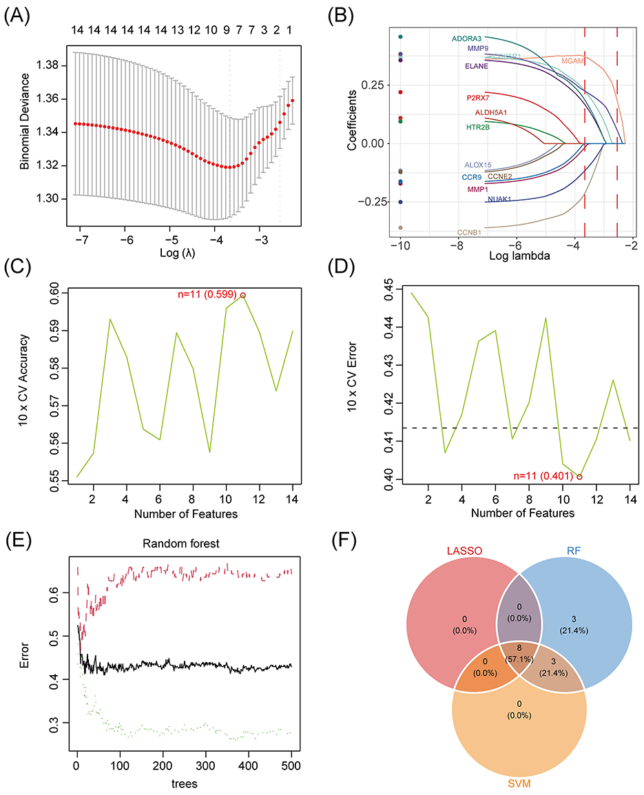 Figure 4. Machine learning screening of antidepressant signature genes of Pueraria diets. (A) Binomial deviation plot for the LASSO model: X-axis represents Log(λ; range −7 to −3), Y-axis represents binomial deviation (range 1.30–1.38), red dashed line marks the optimal λ-value corresponding to the minimum deviation, red dots indicate the location of the minimum deviation, and gray vertical lines show the number of features corresponding to different λ-values (1–14). (B) Plot of characteristic coefficients of LASSO model: X-axis represents Log λ (range −10 to −2), Y-axis represents coefficients (range −0.25 to 0.25), curves show coefficients of characteristics (e.g., ADORA3, MMP1, ELANE, PARP1, etc.) as a function of λ, and the red vertical line marks the location of the optimal λ-value. (C) Plot of 10-fold cross-validation accuracy of SVM model: X-axis indicates the number of features (range 2–14), Y-axis indicates the 10-fold cross-validation accuracy (range 0.55–0.60), the green dot at feature number 11 marks the highest accuracy of 0.599, and the red circle indicates the best point. (D) Plot of 10-fold cross-validation error for SVM model: x-axis indicates number of features (range 2–14), y-axis indicates 10-fold cross-validation error (range 0.40–0.45), green dot at number of features 11 marking the lowest error of 0.401, and red circle indicating the best point. (E) Error rate plot for random forest model: X-axis indicates the number of trees (range 0–500), Y-axis indicates the error rate (range 0.3–0.6), black curve shows the variation of the error rate, red curve indicates the weighted average error rate, and green dashed line indicates the variance of the error rate. (F) Venn diagram of feature gene selection: Circles represent the feature selection results of LASSO, RF and SVM models, with numbers labeled LASSO selects eight feature genes, RF selects 14 feature genes, SVM selects 11 feature genes, and intersection region is eight feature genes.