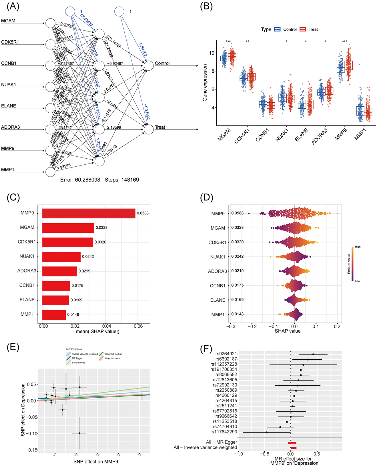 Figure 5. Characteristic gene depression associations based on SHAP model and Mendelian randomization. (A) Artificial neural network graph: input layer includes eight genes (MGAM, CDK5R1, CCNB1, NUAK1, ELANE, ADORA3, MMP9, MMP1), hidden layer with six nodes, output layer with Control and Treat, edge weights to show the strength of the association, training error of 60.288, iterations of 148,169 steps for analysis of the connection between genes and depressive states. (B) Gene expression box-and-line plot: Y-axis indicates gene expression values (range 4–10), X-axis for eight genes (same as A), box color distinguishes between Control (blue) and Treat (red), and significance markers (* indicates p < 0.05, ** indicates p < 0.01, and *** indicates p < 0.001) are used for comparing the expression levels. (C) SHAP significance feature plot): eight genes are listed on the Y-axis, mean absolute SHAP value [mean (|SHAP value|)] on the X-axis, and the bar lengths indicate the significance, which is used to quantify the magnitude of the gene's contribution to the prediction. (D) SHAP beeswarm plot: eight genes on the Y-axis, SHAP values on the X-axis (range −0.3 to 0.2), dot color indicates high or low gene expression (Red for high expression, blue for low expression), and the dot distribution demonstrates the direction and intensity of the effect, which is used to visualize the effect of the genes on the model output. (E) Mendelian randomized scatterplot: taking MMP9 as an example, the X-axis is the effect of SNP on MMP9, the Y-axis is the effect of SNP on depression, and the dots and line segments denote the effect estimates and their confidence intervals, which are used to reveal causal correlations. (F) Mendelian randomized effect plot: Y-axis is SNP identifier, X-axis is Mendelian randomized effect size (MR effect size), dots and line segments show effect estimates and confidence intervals of SNPs on depression for validating the causal role of MMP9.