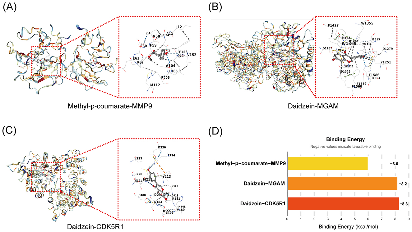 Figure 6. Validation of molecular docking binding affinity of active components of Pueraria with characterized genes. (A) The binding diagram of methyl p-coumarate and MMP9: Showing the molecular docking structure with key amino acids including G61, V58, E59, F153, etc., where G61 and V58 may form a hydrogen bond, which is used to visualize the binding site and interaction pattern. (B) The binding diagram of daidzein with MGAM: Demonstrating the docked conformation, key amino acids including D145, F1427, W1369, etc., W1369, etc. are stabilized by hydrophobic interactions and are used to analyze the binding stability. (C) The binding diagram of daidzein with CDK5R1:Presenting the docking interface, key amino acids including V223, D336, H334, etc. H334 may be involved in hydrogen bonding for resolving the binding region and type of force. (D) Binding Energy Analysis Plot: The X-axis is labeled with Compound-Gene Pairs (Methyl p-coumarate-MMP9, Daidzein-MGAM, Daidzein-CDK5R1), and the Y-axis represents Binding Energy (unit: kcal/mol). The bar height corresponds to energy values, where negative values indicate favorable binding. This plot quantifies affinity strength and enables comparison.