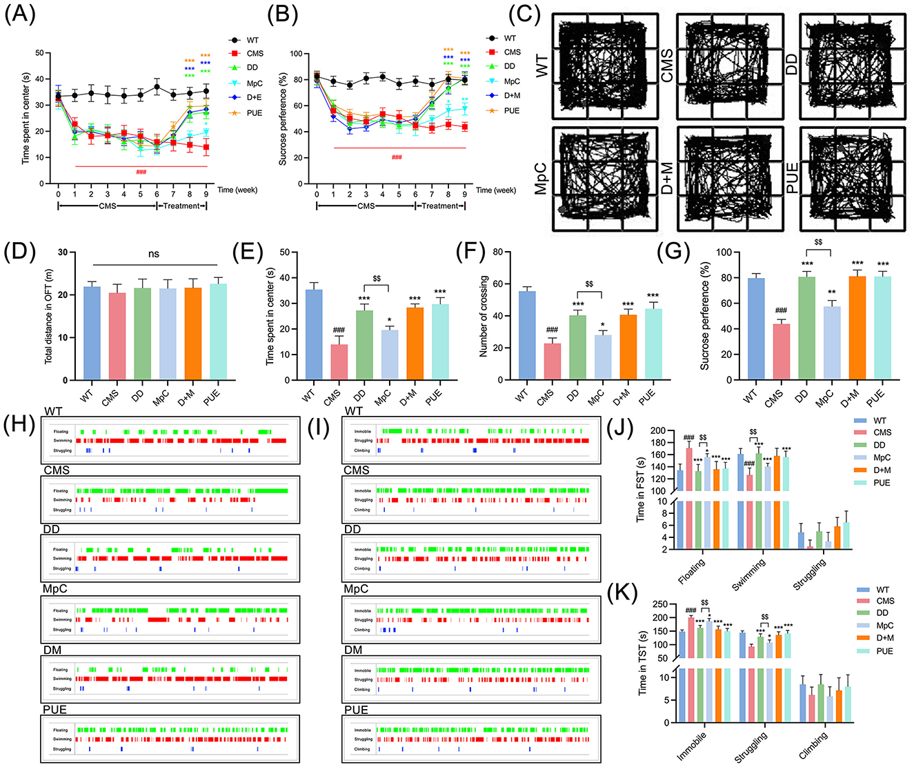 Figure 7. Active components of Pueraria ameliorate depression-like behavior in CMS mice. (A, B) In the OFT and SPT, CMS mice spent significantly less time in the center region (A) and preferred sucrose (B) than wild mice, while DD, McP, D+M, PUE have opposite effects on anxiety behavior in mice relative to CMS mice (n = 6). (C–F) Representative action trajectories of mice (C) were plotted at week 9 to record the total distance of the OFT (D), the time spent in center (E), and the number of crossing (F) was traversed. (G) Quantitative assessment of the sucrose preference in SPT in mice at week 9. (H, I) Representative states of FST (H), TST (I) of mice were plotted at week 9. (J) Quantitative assessment of the floating, swimming and struggling time in mice in FST. (K) Quantitative assessment of the immobile, struggling, and climbing time in mice in the TST. All values were presented as mean ± SEM; $p < 0.01. ###p < 0.001 compared with WT group. *p < 0.05, **p < 0.01, ***p < 0.001 compared with CMS group.