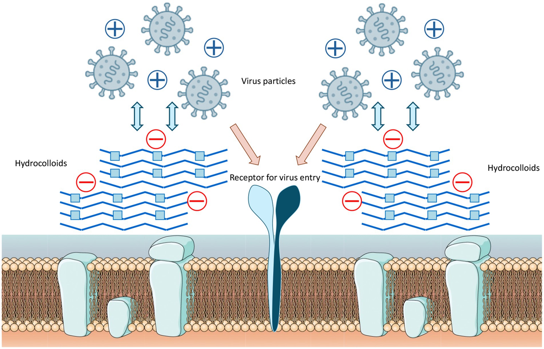 Figure 1. Mechanism of hydrocolloid-mediated viral inhibition by electrostatic interaction. Negatively charged sulphated groups (red circles) interact electrostatically with positively charged amino acids on viral surface proteins, preventing binding to host cell receptors and blocking entry.