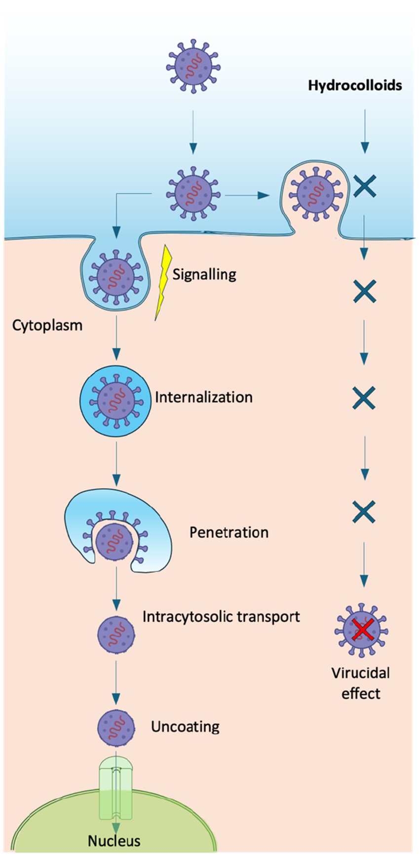 Figure 2. Viral infection pathway and inhibitory role of hydrocolloids. Hydrocolloids block viral attachment, entry, and replication steps, leading to a virucidal effect and preventing the release of the viral genome into the host cell nucleus.
