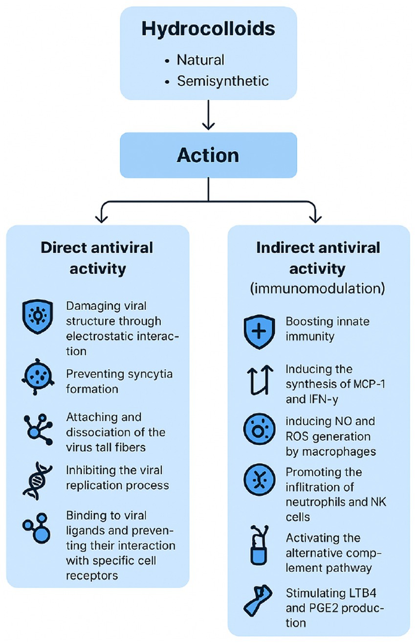 Figure 3. Main direct and indirect antiviral mechanisms of natural and semisynthetic hydrocolloids. Directly, hydrocolloids may block viral attachment and entry, inhibit viral replication, or inactivate viral particles, while is indirect action occurs mainly by modulating host immune responses. These mechanisms are influenced by structural determinants such as sulphation, branching, and molecular weight, which in turn affect clinical translation potential.
