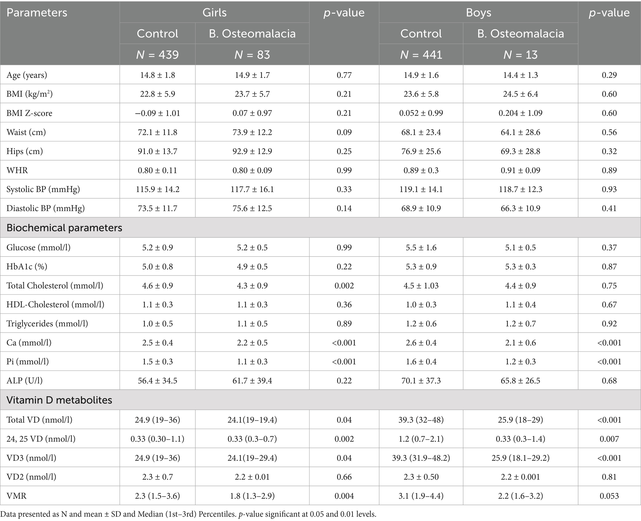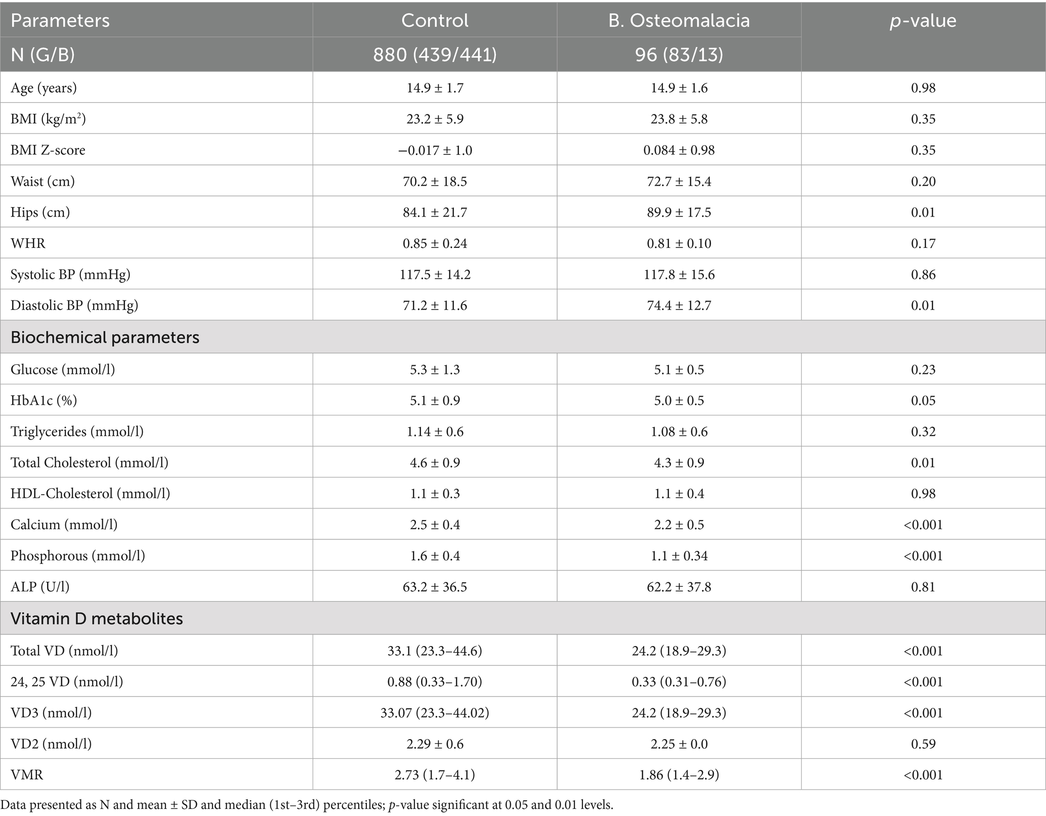 Methods: A total of 976 age- and body mass index-matched adolescents (522 girls, mean age 14.9 ± 1.8 years, body mass index, BMI 23.0 ± 5.9; 454 boys, mean age 14.9 ± 1.7 years, BMI 23.7 ± 5.8) were included in this cross-sectional study. Anthropometrics and biochemical parameters [glucose, lipid profile, calcium (Ca), inorganic phosphorus (Pi), alkaline phosphatase (ALP)] were measured using routine assays. Circulating vitamin D metabolites [24,25(OH)₂D (24, 25 VD), VD2, VD3, total VD] were quantified using LC-MS/MS, and VMR calculated as [24,25 VD/VD] × 100. Deficiency cut-offs were: VD <30 nmol/L, 24,25 VD <3.0 nmol/L, VMR <4%. Biochemical osteomalacia was defined as ≥ 2 abnormal markers (low VD, high ALP, low Ca, or low Pi).