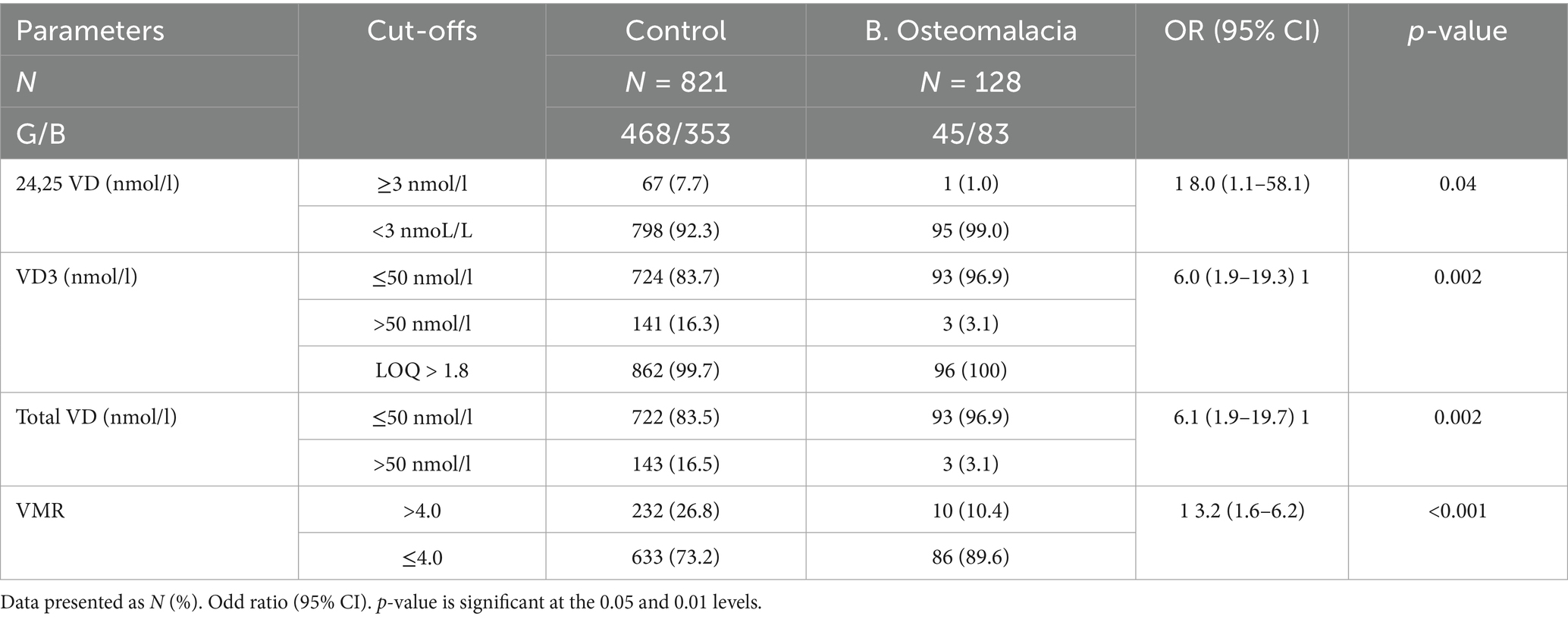 Measurement of circulating vitamin D metabolites was carried out at the Department of Clinical Chemistry, CIRM, University of Liège, Belgium. Serum total VD, VD2, VD3 and 24,25 VD were quantified using a validated liquid chromatography–tandem mass spectrometry (LC–MS/MS) method certified by the Centres for Disease Control and Prevention (CDC) (11). The vitamin D metabolite ratio (VMR) was calculated as: VMR = [24,25 VD/VD] × 100. For this study, deficiency thresholds were defined as total VD < 50 nmol/L (16), 24,25 VD < 3.0 nmol/L, VD2 limit of quantification (LOQ) < 1.8 nmol/L, and VMR < 4%, based on established cut-offs (11). A different cut-off for low total VD was used for the operational definition of biochemical osteomalacia.