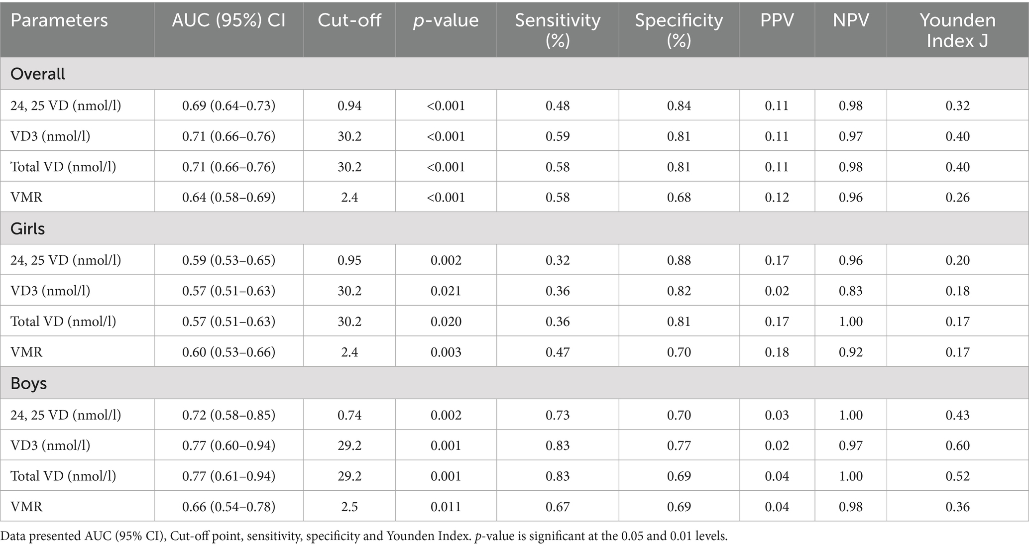 The modest predictive abilities of single VD metabolites in the overall cohort suggest that relying on a single marker may be insufficient for screening biochemical osteomalacia in adolescents. The superior performance of VMR in girls supports the concept that indices reflecting both synthesis and catabolism of vitamin D could better capture subtle metabolic alterations in certain subgroups (9). This aligns with emerging evidence that VMR, as a functional biomarker, may provide additional clinical value over total VD alone, particularly where vitamin D status is influenced by sex hormones, growth demands, and differential sun exposure (30, 31). Conversely, the higher accuracy of VD3 and total VD in boys may reflect more stable metabolic processing of cholecalciferol and a stronger association between low absolute VD levels and mineralization defects in this group (14, 32).