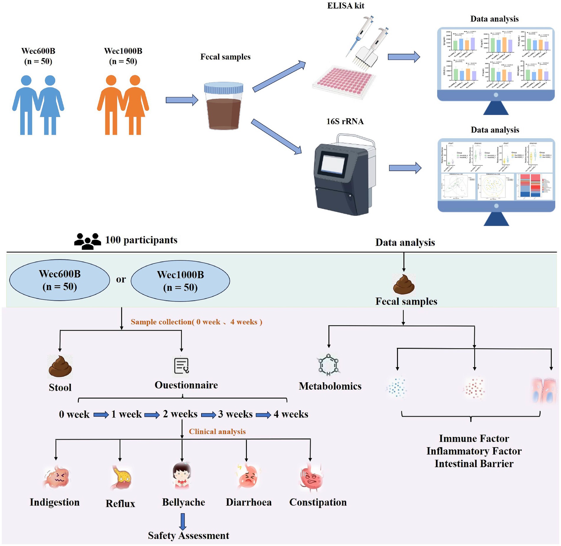 This randomized, double-blind, parallel-group clinical trial enrolled adults with abnormal gastrointestinal function, without gender restrictions. As shown in Figure 1, a total of 100 eligible participants from Luoyang, Henan Province were recruited on a voluntary basis and randomly assigned, in a 1:1 ratio, to either the Wec600B group or the Wec1000B group (n = 50 per group). Baseline demographic characteristics, including age, gender and cultural background, did not differ significantly between the two groups. Participants randomized to Wec600B were administered two sachets daily (3.0 g/sachet; 600 billion CFU per sachet), and those randomized to Wec1000B received two sachets daily (3.0 g/sachet; 1,000 billion CFU per sachet) for 4 weeks. The formulation was administered after lunch and dinner respectively, and was reconstituted only with warm water (approximately 37 °C) for consumption—this temperature was controlled to avoid damaging the probiotic strains. No other food or beverages were allowed to be consumed concurrently with the product during intake. During the intervention period, participants are required to adopt a healthy dietary pattern with a reasonable dietary structure characterized by “diversity of foods and balanced proportions,” with reference to Dietary Guidelines for Chinese Residents (2022). This can be briefly summarized by the “Plate Method”: staple foods (including grains and tubers) accounting for approximately 1/3 of the plate, vegetables and fruits accounting for about 1/2 of the plate, high-quality protein accounting for roughly 1/6 of the plate, and oils, salt and sugar to be consumed in “trace amounts.” The consumption of fermented foods and supplements is not permitted. Regarding physical activity levels, no additional control was required in this study. Participants were only asked to ensure that their physical activity levels throughout the study period (from the start to the end of the study) remained consistent with their activity levels prior to the study (“pre-intervention”).