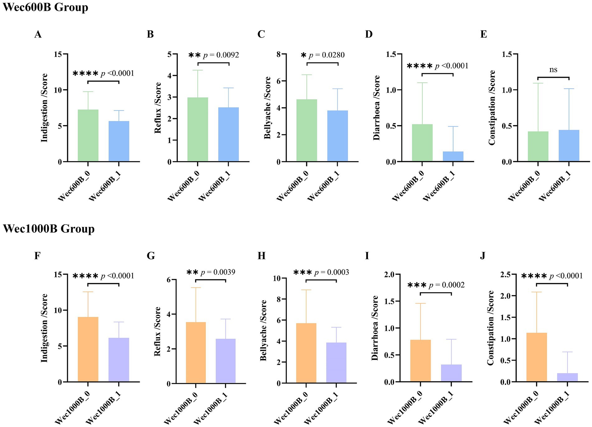 Figure 2. The effects of Wec600B and Wec1000B on gastrointestinal functional symptoms before and after intervention. (A,F) The dyspepsia scores of the Wec600B group and the Wec1000B group. (B,G) The reflux scores of the Wec600B group and the Wec1000B group. (C,H) The abdominal pain scores of the Wec600B group and the Wec1000B group. (D,I) The diarrhea scores of the Wec600B group and the Wec1000B group. (E,J) The constipation scores of the Wec600B group and the Wec1000B group. Wec600B_0 and Wec1000B_0 represent the pre-intervention status of the Wec600B group and the Wec1000B group; Wec600B_1 and Wec1000B_1 represent the post-intervention status of the Wec600B group and the Wec1000B group.