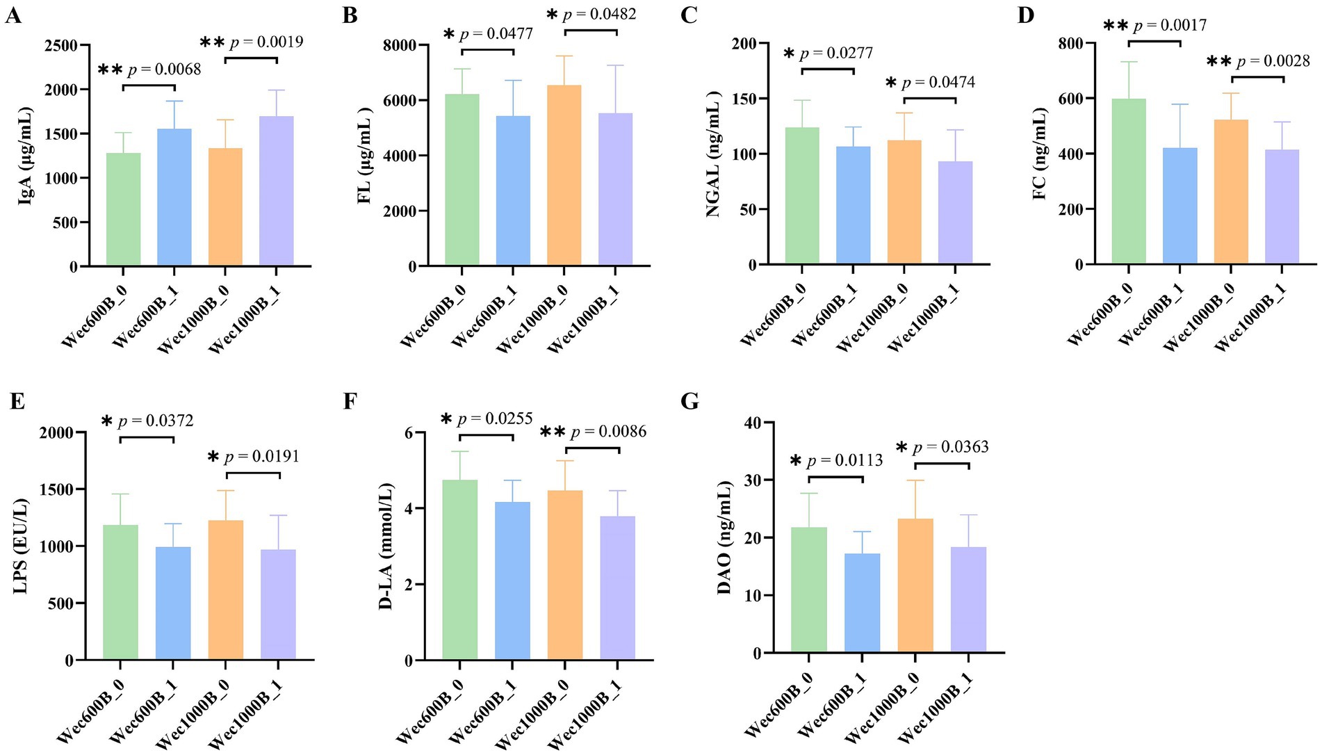 Figure 3. Effects of Wec600B and Wec1000B interventions on immune, inflammatory, and gut barrier markers in feces before and after intervention. (A) IgA. (B) FL. (C) NGAL. (D) FC. (E) LPS. (F) D-LA. (G) DAO. Wec600B_0 and Wec1000B_0 represent the pre-intervention status of the Wec600B group and the Wec1000B group; Wec600B_1 and Wec1000B_1 represent the post-intervention status of the Wec600B group and the Wec1000B group.