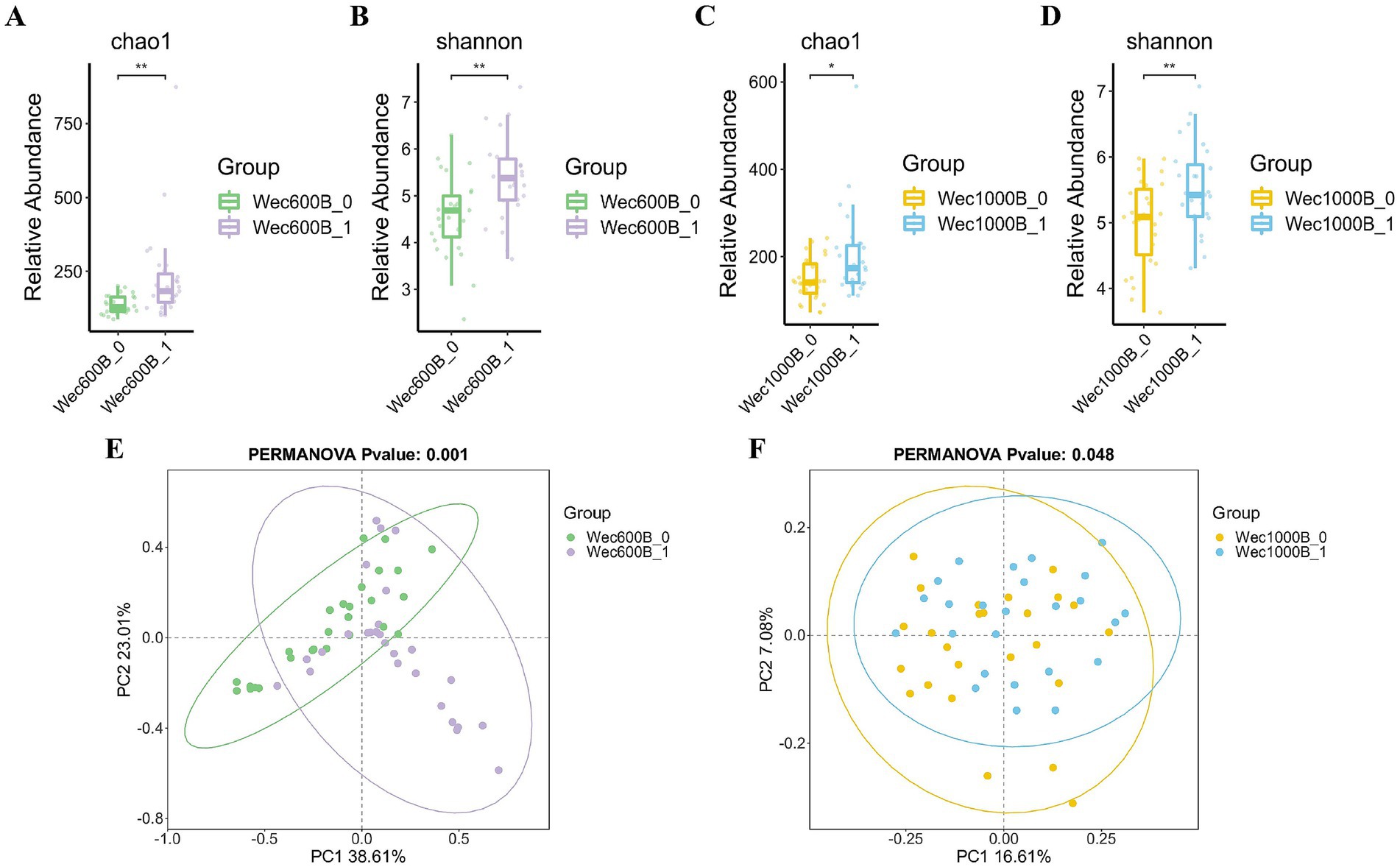 Figure 4. The effects of Wec600B and Wec1000B interventions on the changes in bacterial community diversity and richness in feces. (A) Chao1 plot of the Wec600B group. (B) Shannon plot of the Wec600B group. (C) Chao1 plot of the Wec1000B group. (D) Shannon plot of the Wec1000B group. (E) PCoA plot of the Wec600B group. (F) PCoA plot of the Wec1000B group. Wec600B_0 and Wec1000B_0 represent the pre-intervention status of the Wec600B group and the Wec1000B group; Wec600B_1 and Wec1000B_1 represent the post-intervention status of the Wec600B group and the Wec1000B group. *p < 0.05; **p < 0.01; ***p < 0.001.