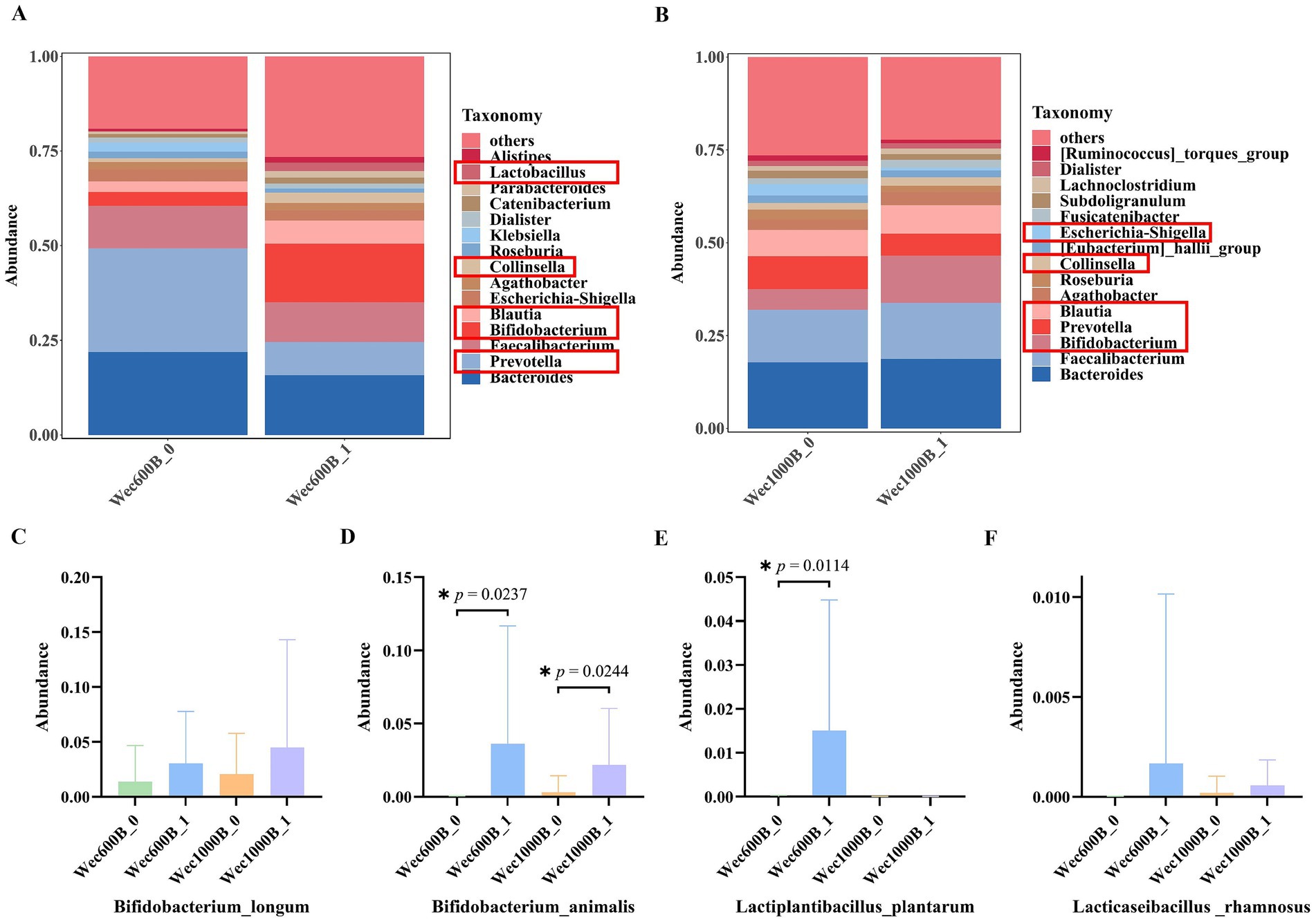 Figure 5. The distribution of microbial community structure and the changes in added strains at the species level after intervention. (A) Relative abundance of bacterial communities at the genus level in the Wec600B group. (B) Relative abundance of bacterial communities at the genus level in the Wec1000B group. (C) Add the strain Bifidobacterium _longum. (D) Add the strain Bifidobacterium _animalis. (E) Add the strain Lactiplantibacillus _plantarum; (F) Add the strain Lacticaseibacillus _rhamnosus. Wec600B_0 and Wec1000B_0 represent the pre-intervention status of the Wec600B group and the Wec1000B group; Wec600B_1 and Wec1000B_1 represent the post-intervention status of the Wec600B group and the Wec1000B group.