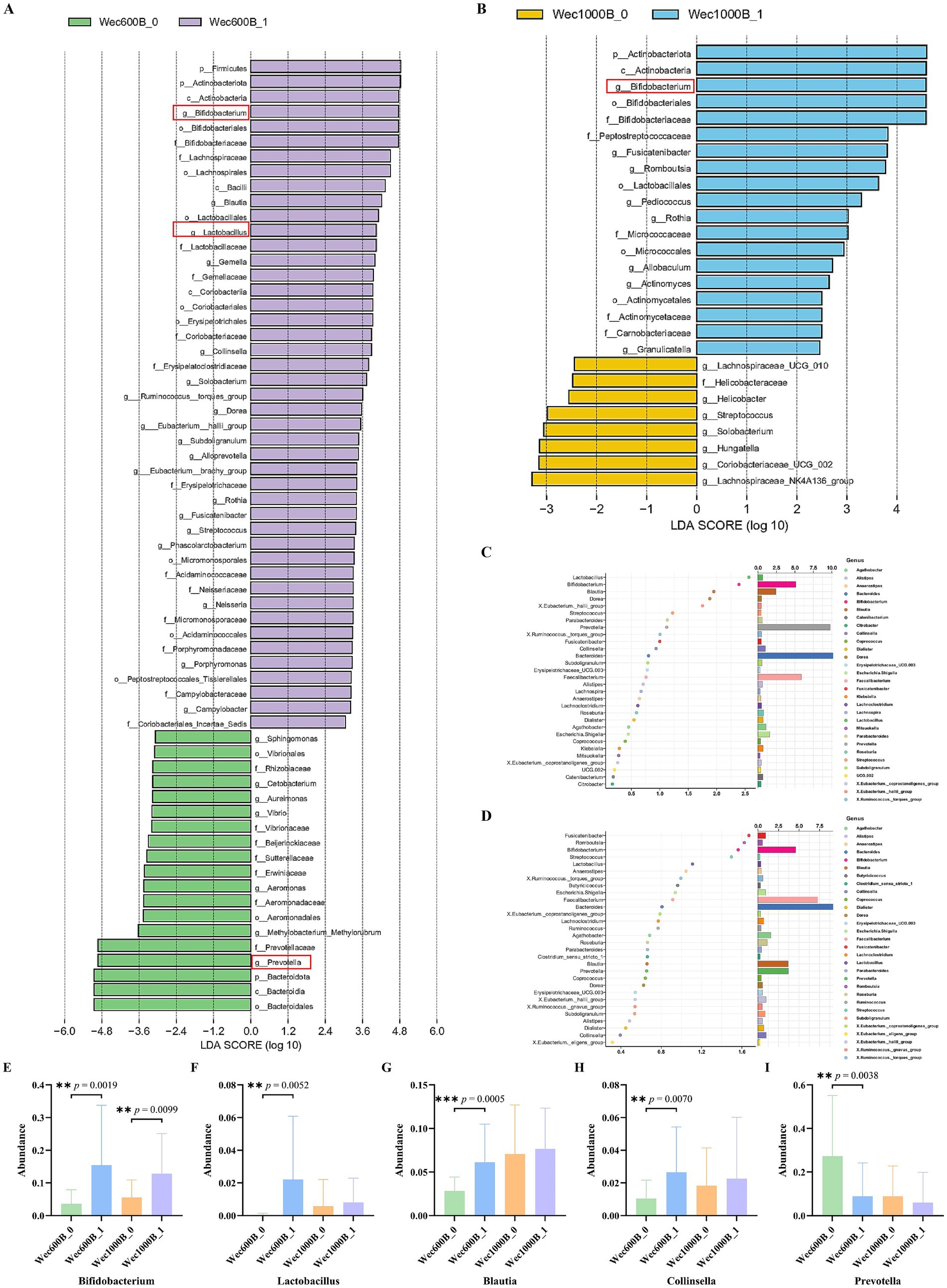 Figure 6. Changes in the microbiota after intervention. (A) LEfSe analysis of the Wec600B group. (B) LEfSe analysis of the Wec1000B group. (C) Random forest analysis of the Wec600B group. (D) Random forest analysis of the Wec1000B group. (E) Different genus Bifidobacterium. (F) Different genus Lactobacillus. (G) Different genus Blautia. (H) Different genus Collinsella. (I) Different genus Prevotella. Wec600B_0 and Wec1000B_0 represent the pre-intervention status of the Wec600B group and the Wec1000B group; Wec600B_1 and Wec1000B_1 represent the post-intervention status of the Wec600B group and the Wec1000B group. *p < 0.05; **p < 0.01; ***p < 0.001.