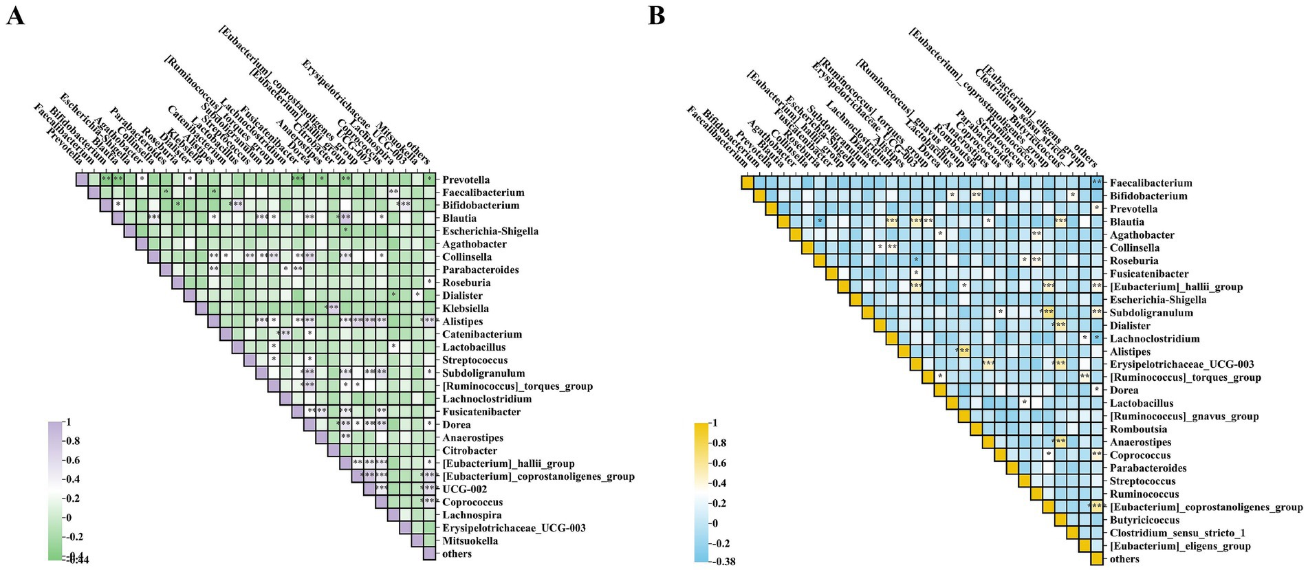 Figure 7. Analysis of inter-microbial correlations post-intervention. (A) Heatmap of the Wec600B group. (B) Heatmap of the Wec1000B group. *p < 0.05; **p < 0.01; ***p < 0.001.