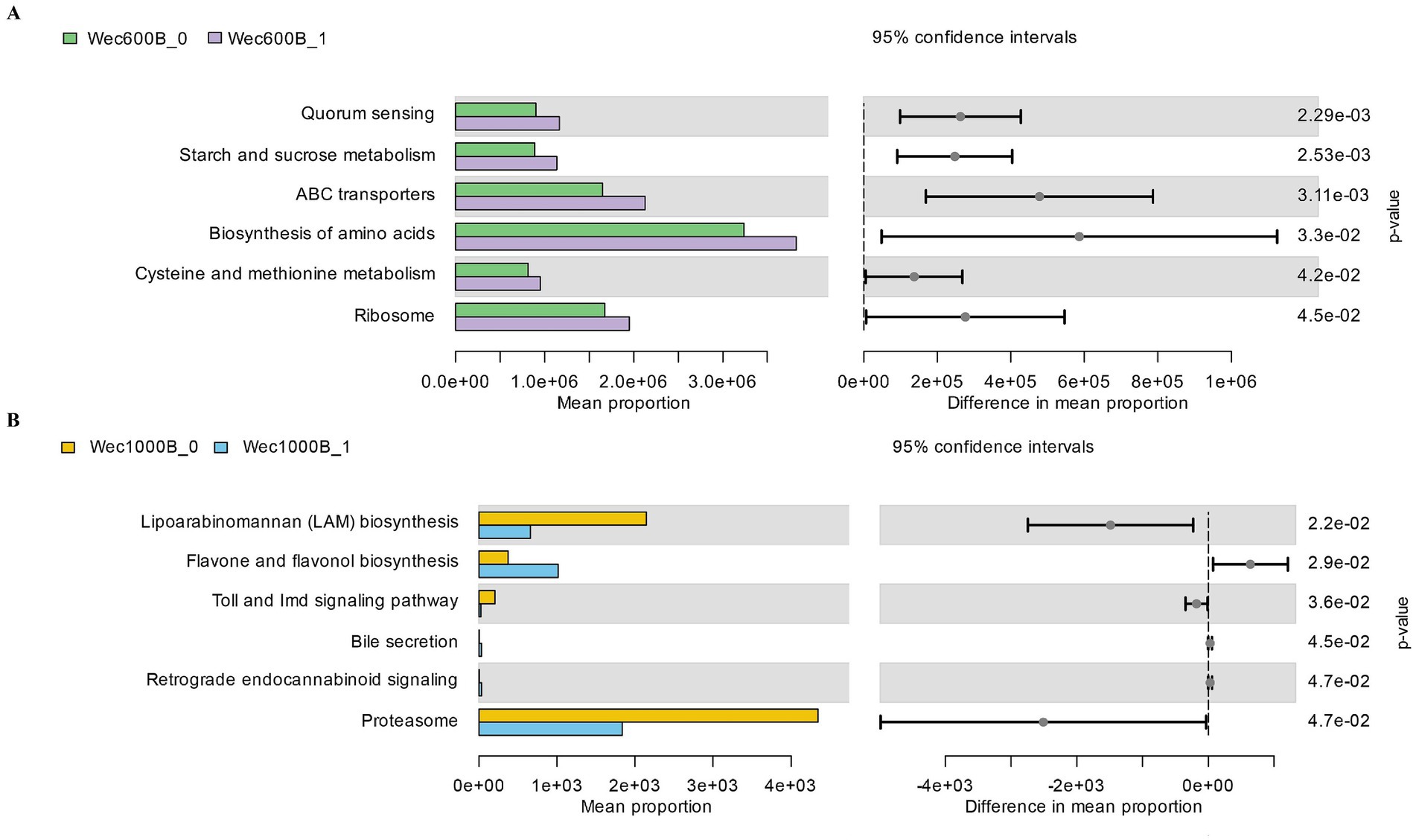 Figure 8. KEGG L3 metabolic pathway. (A) The KEGG L3 metabolic pathway of the Wec600B group. (B) The KEGG L3 metabolic pathway of the Wec1000B group. Wec600B_0 and Wec1000B_0 represent the pre-intervention status of the Wec600B group and the Wec1000B group; Wec600B_1 and Wec1000B_1 represent the post-intervention status of the Wec600B group and the Wec1000B group. *p < 0.05; **p < 0.01; ***p < 0.001.