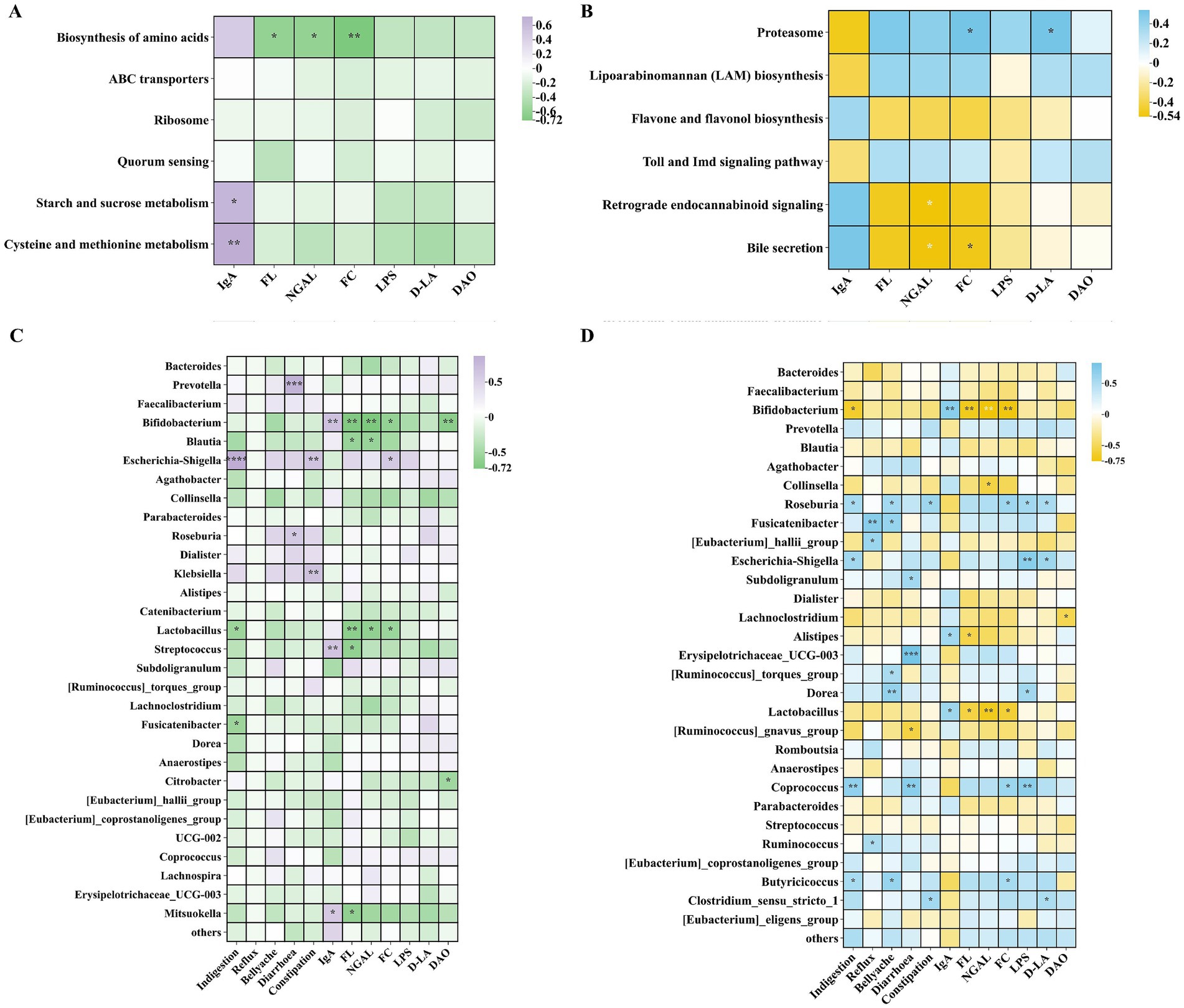 Through correlation analysis of clinical indicators with KEGG L3 metabolic pathways, microbiota with questionnaires, and clinical indicators, this study investigated the ameliorative effects of high-potency multi-strain probiotics on gastrointestinal dysfunction. As illustrated in Figures 9A,B, significant positive correlations were observed between IgA and the metabolic pathways of starch and sucrose metabolism, as well as cysteine and methionine metabolism in the Wec600B group. Conversely, FL, FC, and NGAL exhibited significant negative correlations with the biosynthesis of amino acids. In the Wec1000B group, FC and NGAL demonstrated significant negative correlations with retrograde endocannabinoid signaling and bile secretion, while proteasome showed a negative correlation with IgA and positive correlations with markers of inflammation and intestinal injury. In Figures 9C,D, it can be observed that the beneficial differential bacterial groups Bifidobacterium, Lactobacillus, Blautia, and Collinsella in both groups have a negative correlation with the questionnaire assessment indicators, a positive correlation with IgA, and a negative correlation with inflammatory indicators and intestinal barrier damage markers. The harmful differential bacterial group Prevotella has a positive correlation with the questionnaire assessment indicators, a negative correlation with IgA, and a positive correlation with inflammatory indicators and intestinal barrier damage markers. Especially, the beneficial differential bacterial groups Bifidobacterium and Lactobacillus in both groups have a significant correlation with clinical indicators. Through the above correlation analysis, it is found that the correlation between the Wec1000B group and clinical indicators is stronger and more significant. This indicates that the higher-potency multi-strain probiotic intervention has a strong correlation with the body’s immunity, inflammatory response, and intestinal barrier through the interaction of bacterial communities and metabolic pathways. Combined with the beneficial bacteria effect, it inhibits harmful bacteria, thereby better exerting the role of improving gastrointestinal discomfort symptoms.