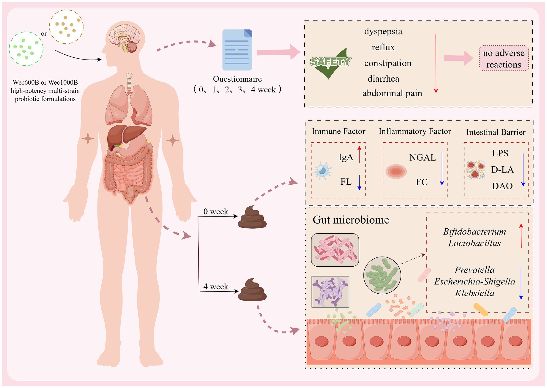 Conclusion: Both Wec600B and Wec1000B high-potency probiotics improved gastrointestinal symptoms and enhanced intestinal health, likely through modulation of gut microbiota composition, reduction of inflammation, and reinforcement of intestinal barrier function.