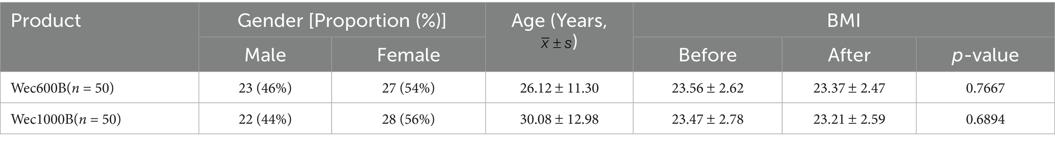 A total of 100 participants from Luoyang, Henan, completed a 4-week intervention study. In the Wec600B product group, there were 23 males and 27 females, with an average age of 26.12 11.3 years. In the Wec1000B product group, there were 22 males and 28 females, with an average age of 30.08 12.98 years. The participants in both groups had similar age, gender, and cultural background levels, and there was no statistically significant difference between the two groups (p > 0.05), making them comparable. As shown in Table 1.