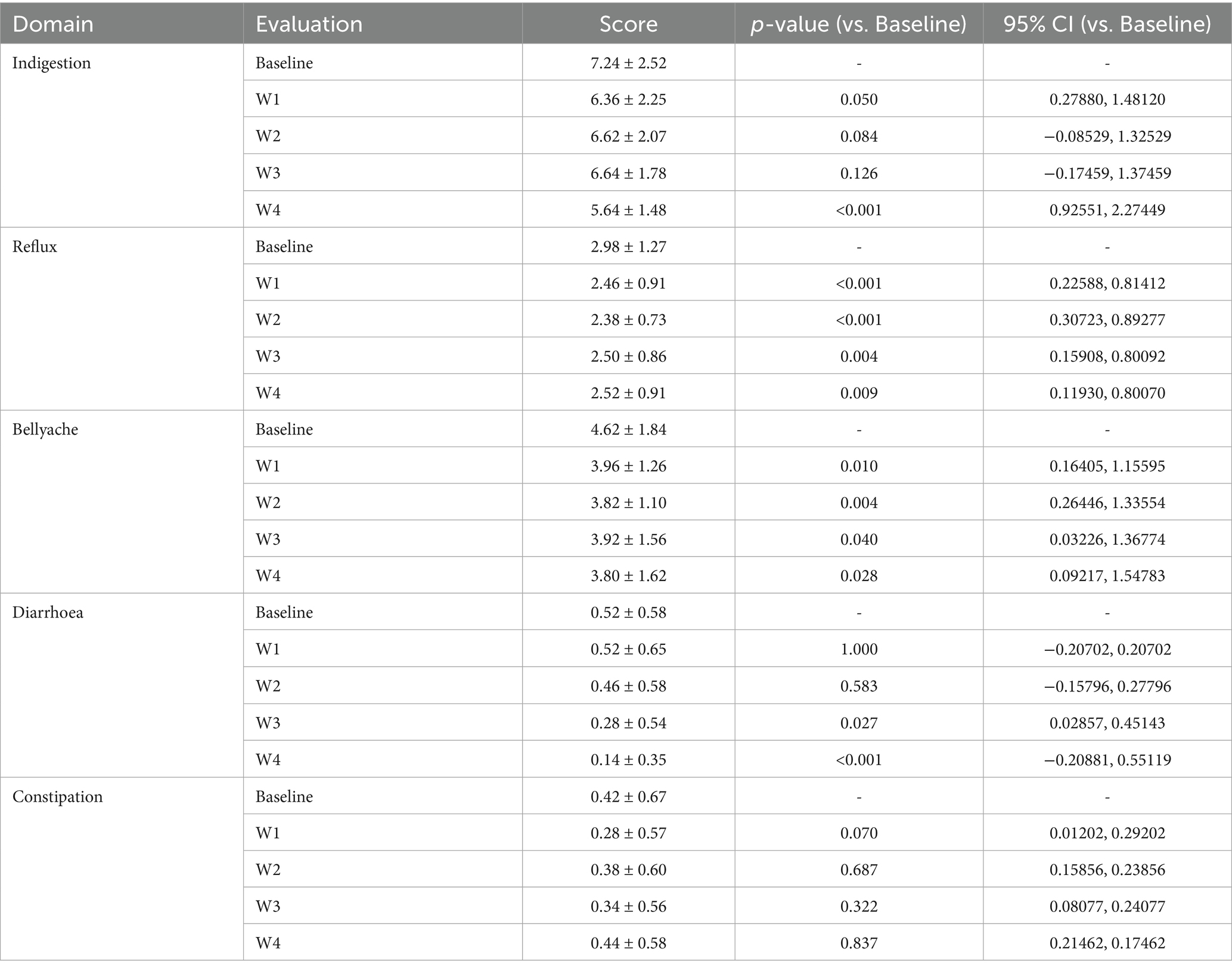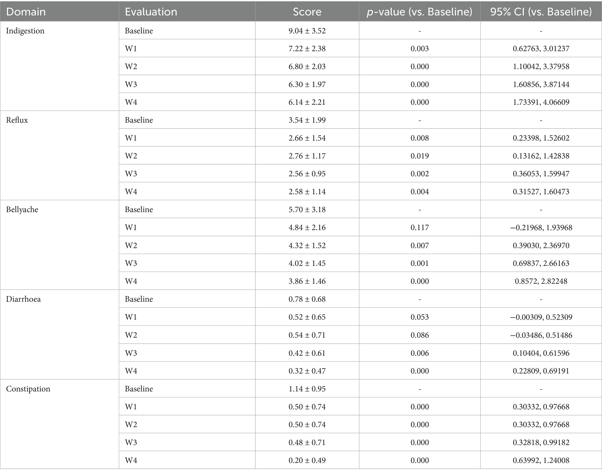 To assess the safety of the high-potency multi-strain probiotic formulations for the participants in the study, the impact on gastrointestinal discomfort symptoms was observed, and relevant safety evaluations were conducted. In this study, symptom scoring questionnaires for heartburn, acid reflux, hunger-related epigastric pain, nausea, belching and flatulence, borborygmi, abdominal bloating, increased flatulence, abdominal pain, constipation, and diarrhoea were collected at weeks 0, 1, 2, 3, and 4, according to the GSRS scoring scale, which was divided into 5 dimensions (23): dyspepsia (abdominal bloating, increased flatulence, belching and borborygmi), abdominal pain (abdominal pain, hunger-related epigastric pain, nausea), reflux (heartburn and acid reflux), constipation, and diarrhoea. Each item was rated from no symptoms to very severe based on severity, with a total of 7 levels (24). Among them, the 4 items included in dyspepsia were rated from no symptoms to very severe based on severity, with a total of 6 levels; constipation and diarrhoea were rated from no discomfort to severe discomfort, with a total of 4 levels (25). The results are shown in Tables 2, 3 and Figure 2. At one week of intervention, symptoms such as dyspepsia and reflux were significantly relieved, and other symptoms also improved. The improvement of intestinal function gradually strengthened with the extension of intervention time, and participants experienced reduced gastrointestinal discomfort. Both constipation and diarrhoea symptoms were improved. Mild loose stools significantly decreased after one week of intervention and continued to improve in the subsequent period; moderate and severe loose stools were also rapidly relieved after intervention and were almost absent in the fourth week. In summary, after four weeks of high-potency multi-strain probiotic intervention, the gastrointestinal symptoms of the study participants were significantly reduced compared to the baseline level, and constipation and diarrhoea could be effectively reduced. There were no adverse reactions. It can be observed that the symptom improvement effect of the Wec1000B group is better than that of the Wec600B group, indicating that the high-potency multi-strain probiotic preparation has better safety and gastrointestinal regulatory effects, and is more conducive to improving gastrointestinal health.
