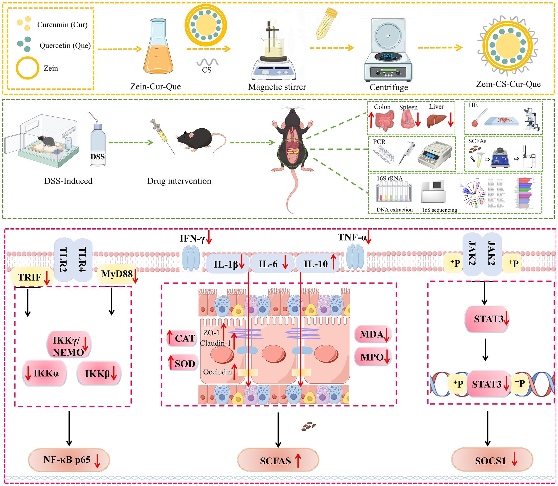 Conclusion: Nanoparticles (Zein-CS-Cur-Que) can significantly reduce inflammatory reaction, restore intestinal barrier, regulate the expression of related protein genes in TLR4/NF-κB and JAK2/STAT3 pathways, and significantly improve ulcerative colitis. Furthermore, the construction of Zein-CS-Cur-Que provides a scientific basis for increasing curcumin targeting and ameliorating ulcerative colitis.