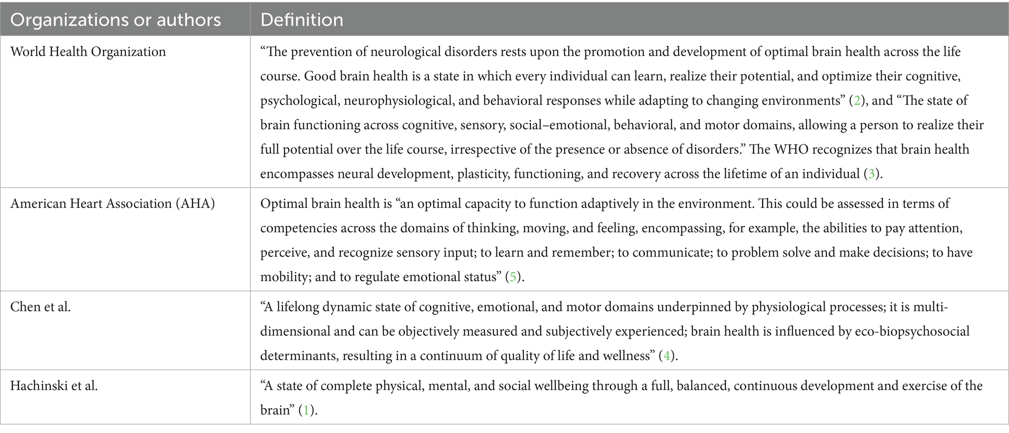 Since the brain is the mediator of all our experiences and the agent of all our behaviors, brain health is critical for social wellbeing, productivity, creativity, and physical and mental health (1). However, there is no universally accepted definition of brain health. Nonetheless, according to the definitions provided by different researchers and organizations (1–5), brain health primarily consists of neurological health and mental health (Table 1). Neurological disorders are one of the leading causes of death globally, with 3.4 billion people affected by neurological health loss in 2021 and 11.1 million deaths attributed to neurological disorders (6). According to the 2019 Global Burden of Diseases, Injuries, and Risk Factors Study, mental illnesses continued to rank in the top 10 global sources of burden, with anxiety and depressive disorders being the most prevalent (7). Given that neurological and mental health disorders impose a growing global burden, there is a critical need for brain health prevention measures.
