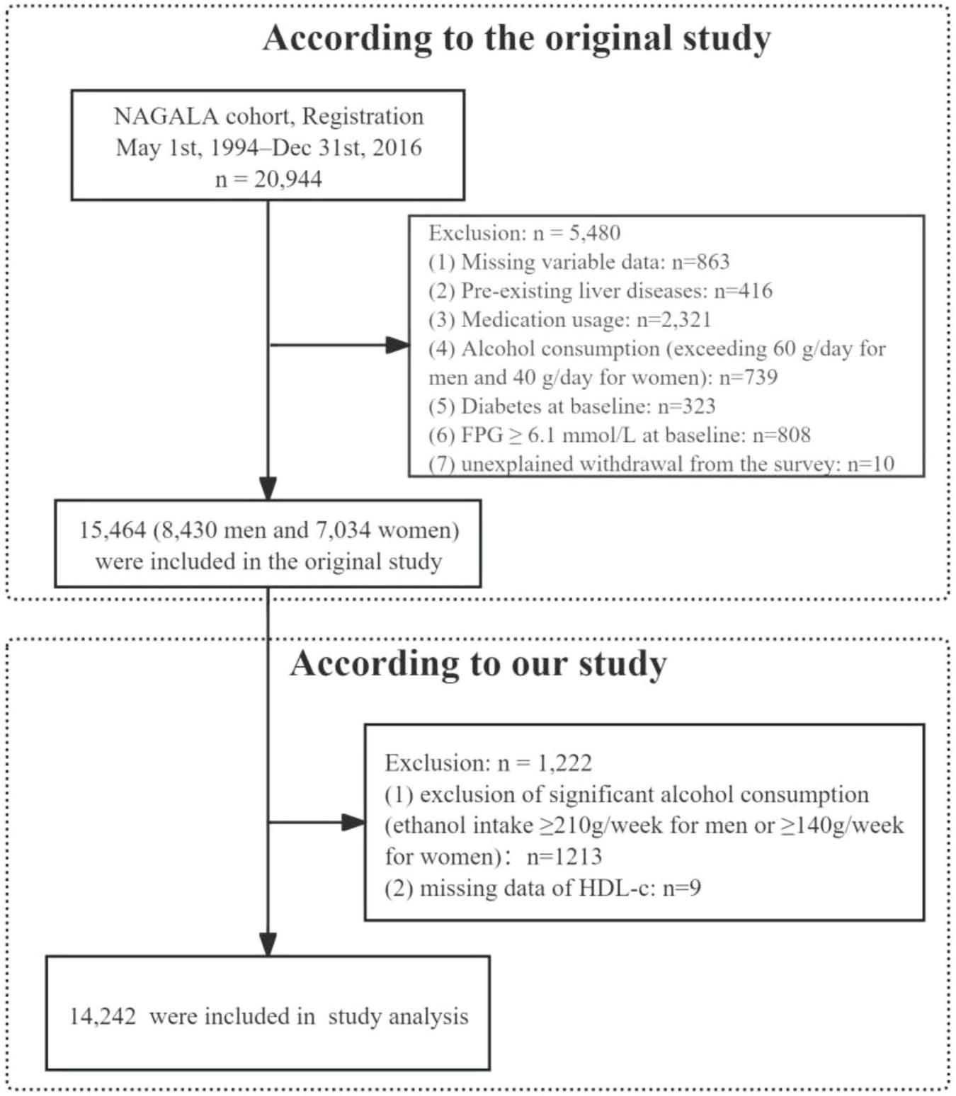 This study was conducted as a secondary analysis based on the NAGALA (NAfld in the Gifu Area, Longitudinal Analysis) database, details of which were previously published by Okamura et al. (23). The database data have been deposited in Dryad, an open-access data repository, and are publicly accessible to all researchers1. Furthermore, ethical approval and informed consent procedures were described in Okamura et al.’s original study, and our research strictly followed the ethical guidelines outlined in the Declaration of Helsinki. A total of 15,464 participants were initially obtained from the NAGALA database via Dryad. According to our research criteria, we excluded 9 participants who lacked high-density lipoprotein cholesterol (HDL-C) measurements and 1,213 participants whose alcohol consumption was ≥210 g/week for men or ≥140 g/week for women. Consequently, 14,242 participants were included in the final analysis (Figure 1). It is important to note that the specific NAGALA cohort we analyzed, as defined by Okamura et al., explicitly excluded individuals with diabetes at baseline (23). Therefore, our study population inherently consists of participants without pre-existing diabetes.