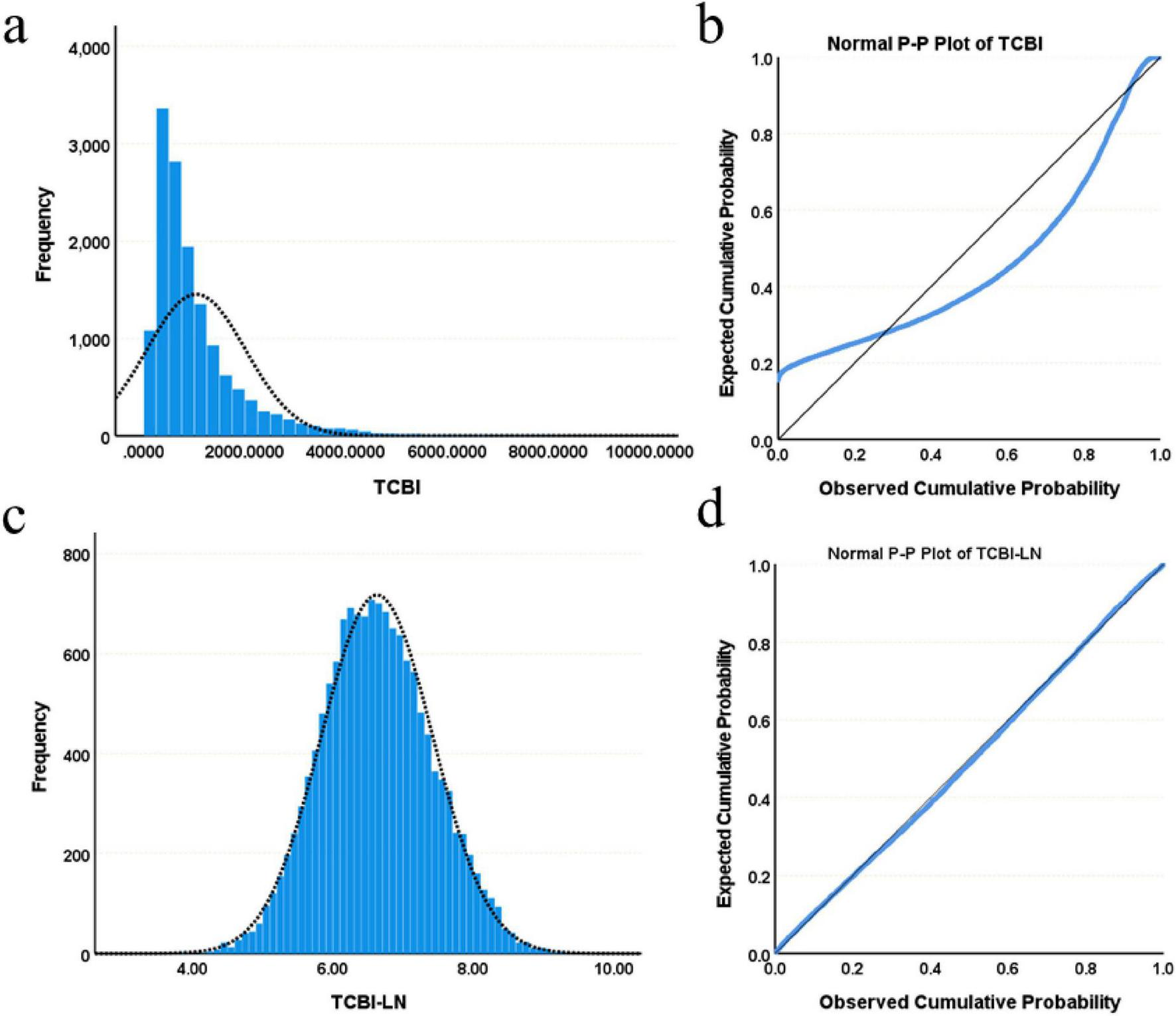 Distribution characteristics of TCBI and TCBI-LN. (a) Histogram of TCBI. (b) Normal P-P plot of TCBI. (c) Histogram of TCBI-LN. (d) Normal P-P plot of TCBI-LN.
