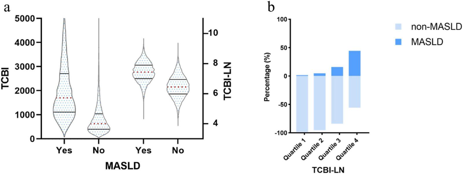 (a) Distribution of TCBI and TCBI-LN according to MASLD status; (b) Prevalence of MASLD across TCBI-LN quartiles by diagnostic category.