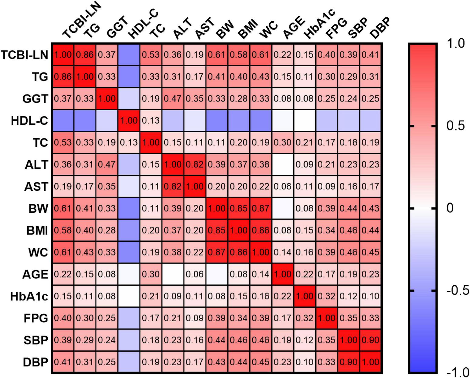 Pearson correlation analysis was conducted to assess the associations between TCBI-LN and various metabolic and anthropometric parameters. TCBI-LN showed statistically significant correlations with all analyzed variables (all P < 0.001). TG exhibited the strongest positive correlation with TCBI-LN compared to other parameters (r = 0.86 for TG; r = 0.61 for BW; r = 0.61 for WC; r = 0.58 for BMI; r = 0.53 for TC; r = 0.41 for DBP; r = 0.40 for FPG; r = 0.39 for SBP; r = 0.37 for GGT; r = 0.36 for ALT; r = 0.22 for age; r = 0.19 for AST; r = 0.15 for HbA1c), with the exception of HDL-C (r = −0.47) (Supplementary Table 1). The correlation heatmap further illustrated a consistent pattern of metabolic disturbances and highlighted strong interrelationships among key components of metabolic syndrome and hepatic function markers associated with elevated TCBI-LN levels (Figure 4).