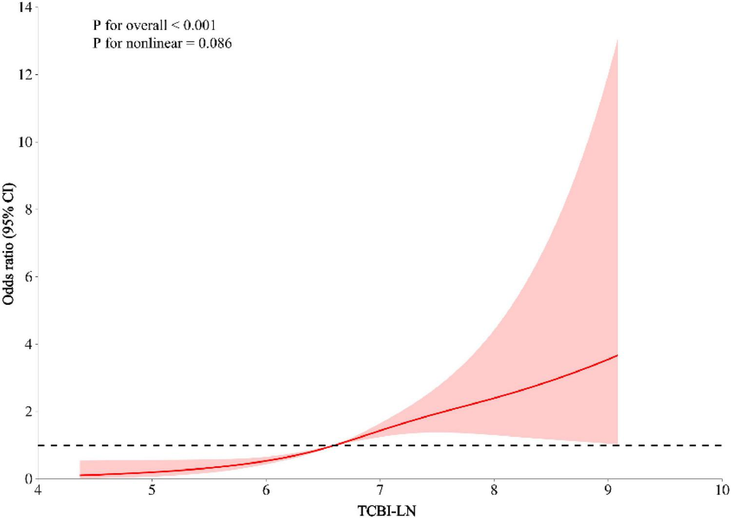 Among the 14,242 participants, the mean age was 43.53 ± 8.89 years, and 48.03% were female. In the fully adjusted model, each 1-unit increase in TCBI-LN was associated with a 1.69-fold increased risk of MASLD (OR = 2.69, 95% CI: 2.00–3.64, P < 0.001). Compared to quartile 1, participants in quartile 4 of TCBI-LN had a 2.91-fold higher risk of MASLD (OR = 2.91, 95% CI: 1.94–4.35, P < 0.001). Trend analysis and RCS curve fitting revealed a positive linear and dose-response relationship between TCBI and MASLD risk. Subgroup analysis showed that TCBI was a stronger predictor of MASLD in individuals with abnormal body mass index (BMI) or normal waist circumference (WC). ROC analysis indicated that TCBI had good predictive performance for MASLD among individuals with normal BMI (AUC = 0.810, 95% CI: 0.801–0.822).