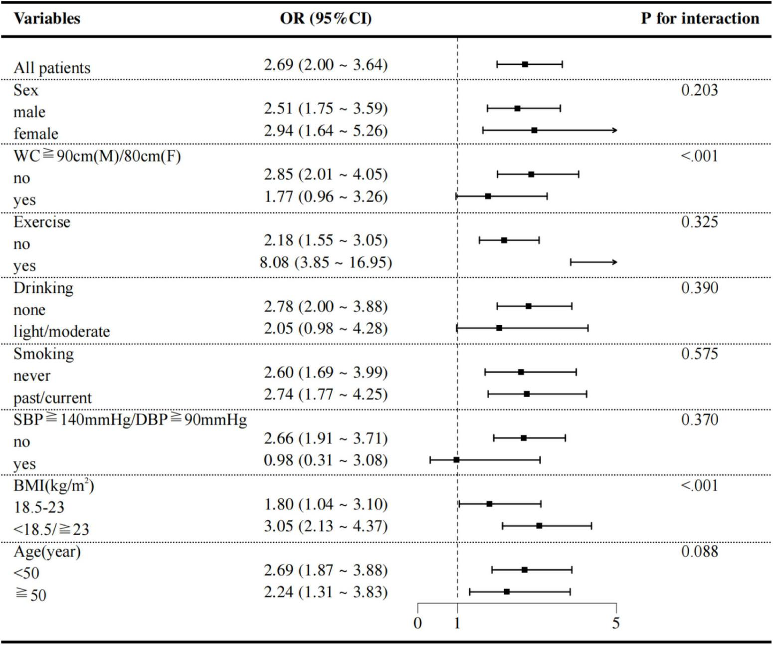 The robustness of the association between TCBI and MASLD was further examined through several subgroup and interaction analyses. As shown in Figure 6, the relationship between TCBI-LN and MASLD remained consistent across subgroups defined by sex (male or female), exercise (no or yes), drinking status (none or light/moderate), smoking status (never or past/current), presence of SBP ≥ 140 mmHg or DBP ≥ 90 mmHg (no or yes), and age ≥ 50 years (no or yes). In contrast, significant interaction effects were observed for both BMI and WC (P for interaction < 0.01). Specifically, the positive association was more pronounced among individuals with normal WC (OR = 2.85, 95% CI: 2.01–4.05) and those who were underweight or overweight/obese (OR = 3.05, 95% CI: 2.13–4.37).