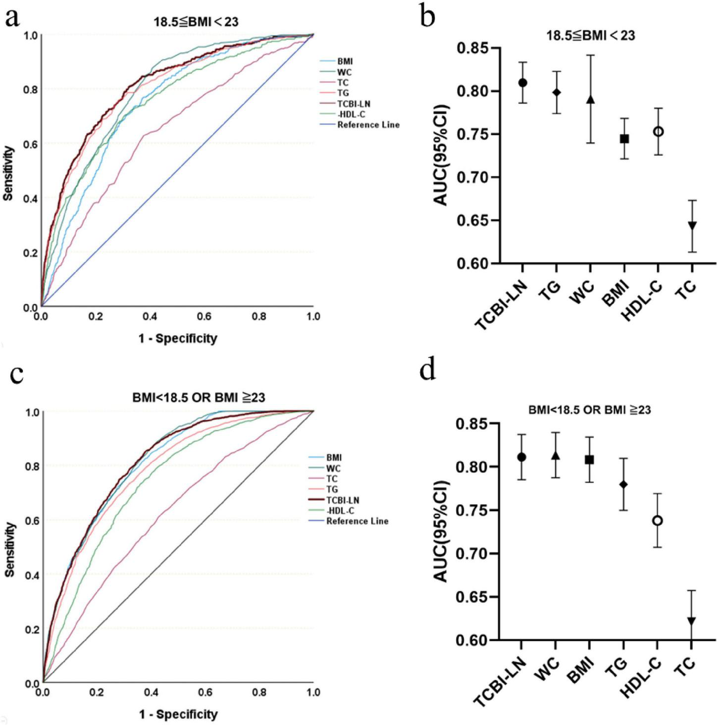 Diagnostic accuracy of TCBI for MASLD risk stratification across BMI categories. (a) ROC curves for BMI 18.5–23. (b) AUC values for BMI 18.5–23. (c) ROC curves for BMI < 18.5 or ≥ 23. (d) AUC values for BMI < 18.5 or ≥ 23.