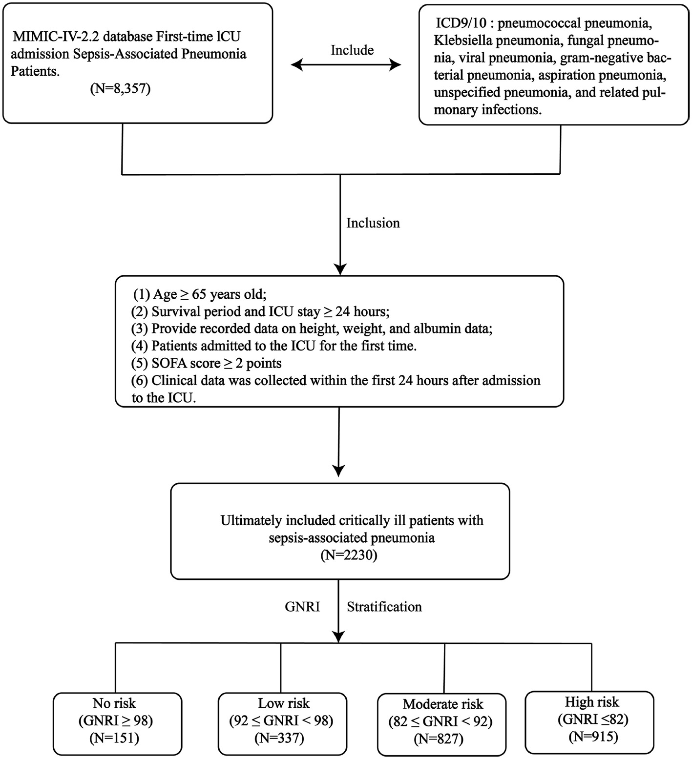 However, a targeted investigation into the prognostic value of GNRI specifically in the high-risk population of critically ill patients with sepsis-associated pneumonia is lacking. The pathophysiological interplay between nutritional status, immune competence, and sepsis progression is particularly salient in this context, yet it remains an underexplored nexus in prognostic research (21, 22). To address this knowledge gap, we conducted a retrospective cohort study leveraging the large-scale Medical Information Mart for Intensive Care IV (MIMIC-IV) database as a derivation cohort, complemented by an external validation cohort. To comprehensively evaluate the relationship between GNRI and short-term prognosis of sepsis associated pneumonia, and to provide a clinically feasible strategy for improving risk stratification and personalized management of this vulnerable patient population.