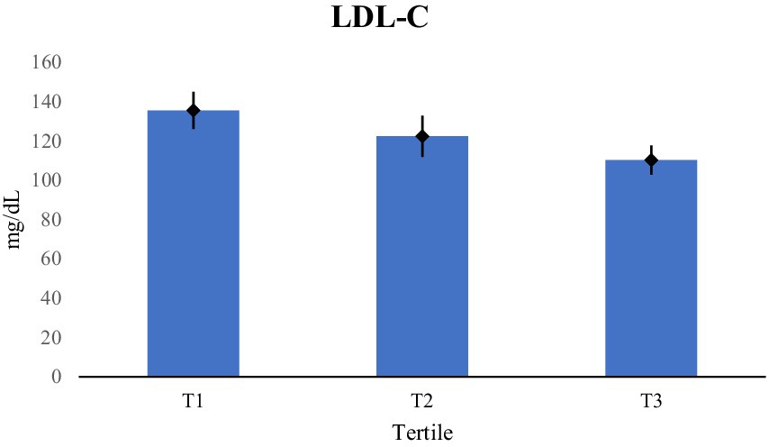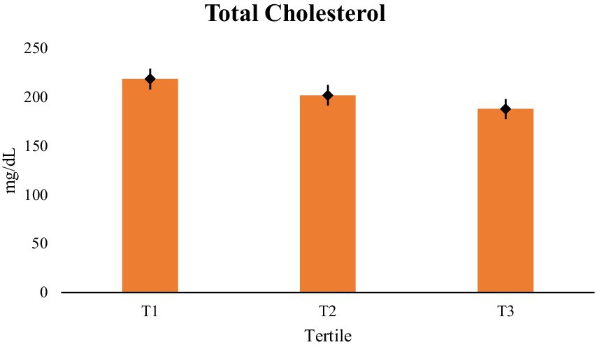 Table 2 summarizes lipid levels based on tertiles of dietary fat quality. Serum lipid contents and dietary fat quality were shown to be clearly and consistently correlated. Higher dietary fat quality gradually reduced total cholesterol, and all pairwise comparisons were statistically noteworthy (p < 0.001). With a distinct dose–response gradient, the post-hoc comparisons shown in Table 3 verify that individuals in the highest tertile had substantially reduced cholesterol values compared to individuals in the middle and lowest tertiles (Figure 1).