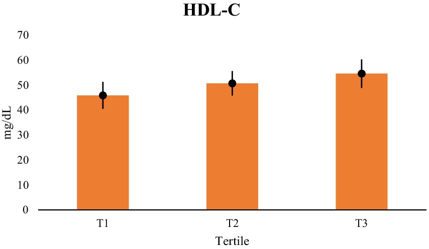 The same pattern was seen in LDL-C, which decreased across tertiles, with substantial variations shown in Table 4. There was a significant difference between each tertile, suggesting that decreased LDL-C levels were linked to both moderate and major increases in dietary fat quality (Figure 2). Table 2 displays a stepwise boost in HDL-C across tertiles, with Table 5 providing specifics on noteworthy pairwise comparisons. The positive correlation between preventative lipoproteins and fat quality was further supported by the significantly higher HDL-C levels shown by respondents in the top tertile as opposed to the lower tertiles (Figure 3).