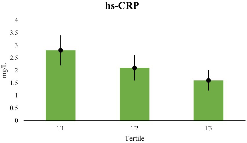 One of the main mechanisms connecting food habits and cardiovascular ailments is inflammation (4, 5). After controlling for relevant confounders, the current study demonstrated that blood hs-CRP concentrations were considerably lower in those with higher dietary fat quality. Our study group had a relative decrease of about 44% (from 2.85 to 1.59 mg/L), with the adjusted mean difference between the greatest and lowest fat-quality tertiles being −1.26 mg/L. hs-CRP levels less than 1 mg/L indicate low risk of heart disease, those between 1 and 3 mg/L indicate intermediate danger, and those greater than 3 mg/L indicate serious risk (17). Therefore, even though the average amount in the highest tertile stayed within the intermediate-risk category, the reported shift indicates a significant reduction in systemic inflammation. Increased unsaturated fat consumption may, mechanistically, decrease hs-CRP by inhibiting PPAR-α activation and NF-κB signaling, which together diminish cytokine release and hepatic fat storage, thereby moderating systemic inflammation and decreasing IL-6-mediated CRP generation (13, 18–27).
