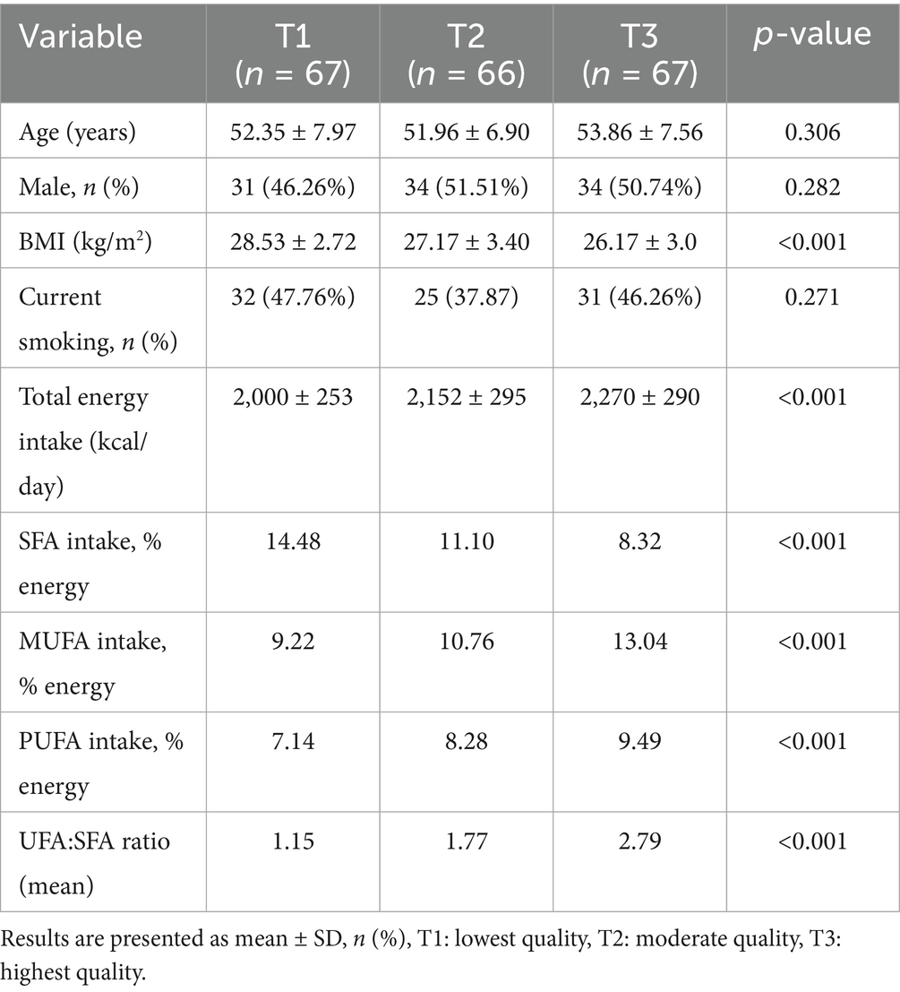 The baseline features were presented as frequency (percentages) throughout dietary fat quality tertiles or as averages ± standard deviations (SD). Analysis of covariance (ANCOVA) was used to assess variations in cardiovascular risk indicators after controlling for relevant factors such as age, BMI, gender, total energy intake and smoking status. Covariates were selected a priori based on knowledge of their correlation with inflammation and lipid indicators. For pairwise comparisons, Tukey’s post-hoc test was used, and p-trend estimates were used to evaluate linear trends among tertiles. A p-value of less than 0.05 is regarded as statistically significant, and all statistical analyses were carried out using SPSS version 26.0 (IBM Corp., Armonk, NY, United States).