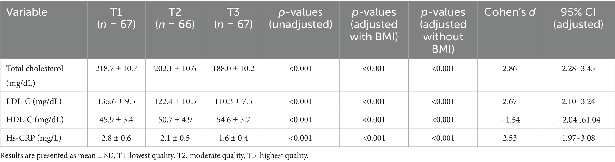 The substantial standardized effect sizes (Cohen’s d = 2–3) highlight that tertile-based grouping inherently promoted between-group contrast and minimized within-group variance. So, instead of representing causal or interventional impacts, these magnitudes show large cross-sectional separations among extreme dietary-fat-quality categories (Table 2).