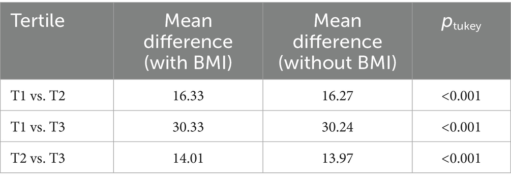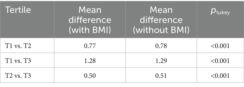 Sensitivity tests with and without BMI adjustments produced similar findings, suggesting that BMI had no bearing on the relationships that were observed. This implies that BMI served more as a confounding factor than a mediating factor (Tables 3–6).