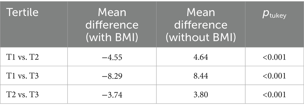 There was no discernible age-related bias because the average age was similar among the groups. Additionally, the proportions of male and female was comparable, indicating balanced representation of both sexes. The body mass index showed a distinct gradient, reaching its maximum in the lowest tertile and gradually declining in the middle and highest tertiles (p < 0.001). This association implies that those who consume more meals high in unsaturated fat typically have lower total body mass. However, BMI should be viewed as indicating variations in total body mass rather than exact body composition, though, because it does not differentiate between fat and lean mass. The incidence of smoking did not follow an even trajectory; the center tertile had somewhat lower proportions than the two extremes (Table 1).