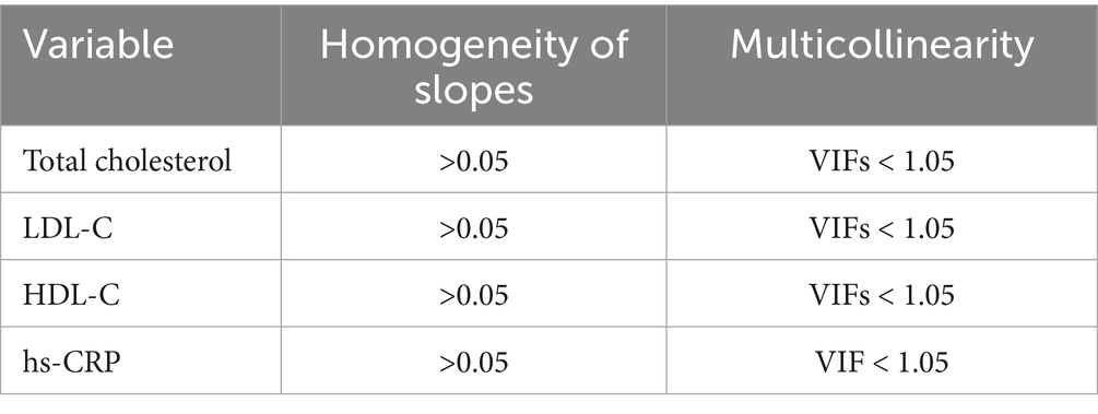 Each biochemical assessment was taken from standard hospital laboratory records that were gathered during the clinical visits of the patients. Before having their blood drawn, individuals were told to fast for at least 8 h. Following standard operating methods, venous blood was drawn, serum was extracted by centrifugation within 2 h of the draw, and the results were examined at the hospital diagnostic laboratory. A conventional clinical chemistry instrument was used to measure the serum concentrations of total cholesterol (TC), low-density lipoprotein cholesterol (LDL-C), and high-density lipoprotein cholesterol (HDL-C) utilizing automated enzymatic colorimetric techniques. High-sensitivity C-reactive protein (hs-CRP) concentrations were retrieved from immunoturbidimetric tests reported in the same records.