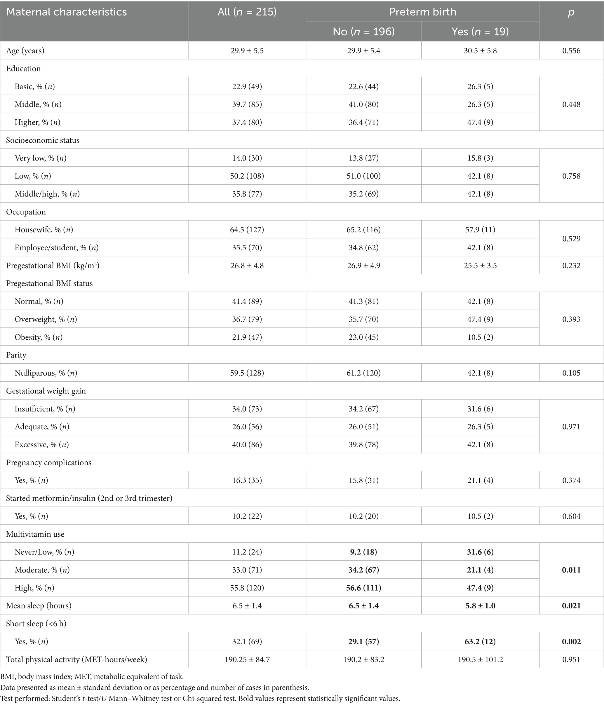 Results: Mean fasting was 11.8 ± 1.2 h; AM, PM latency were 104.4 ± 76.7, 112.3 ± 54.5 min, respectively. Nighttime eating was present in 33% (n = 71) of women. Gestational complications prevalence was 16.3% (n = 35). Half of women had a high MV-consumption (55.8%, n = 120). PTB was present in 8.8% (n = 19) of pregnancies. A higher frequency of PTB was observed with nighttime eating (15.5% vs. 5.6%; p = 0.16), with low MV-consumption (low: 25%, moderate: 5.6%, high: 7.5%; p = 0.011) and with short sleep (63.2% vs. 29.1%; p = 0.002). Regression models showed that nighttime eating (OR:5.716, 95%CI:1.724–18.951), low MV-consumption (OR:7.937, 95%CI:1.873–33.639), short sleep (OR:4.551, 95%CI:1.392–14.879) and PE (OR:9.016, 95%CI:1.772–45.881) were positively associated with PTB risk. Other maternal variables in the model (R2 = 0.318, p = 0.010) were not associated (age, obesity, parity, GDM, GWG, energy intake).